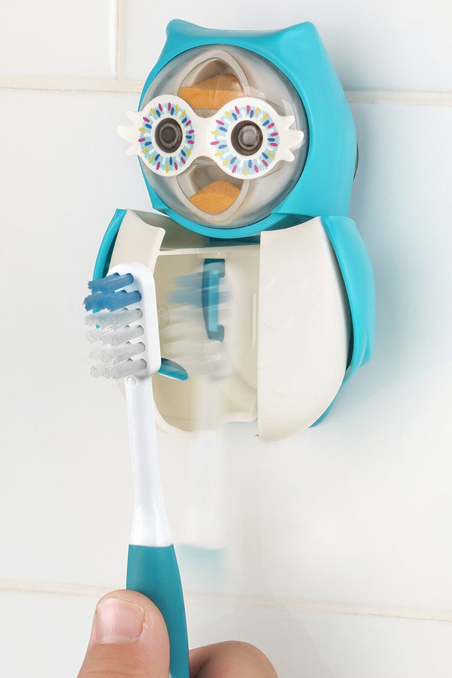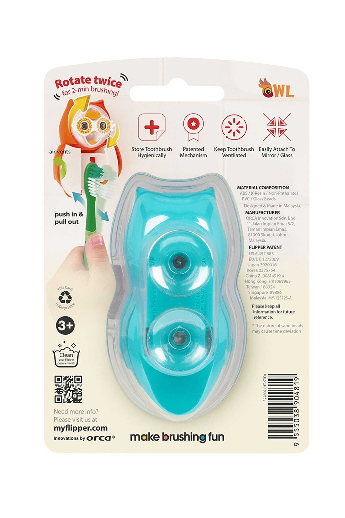 Flipper Diş Fırçası Kabı Baykuş Mavi Flipper Baykuş Figürlü Kum Saatli Fırça Saklama Kabı, çocukların diş fırçalarını güvenle saklamasına yardımcı olur. ; Tek bir fırça hareketi ile otomatik açılıp kapanan kapaklar, diş fırçalamaya eğlence katar. ; Flipper aynaya veya fayansa güçlü vakumları ile yapışır, diş fırçalarını dış etkenlere karşı korur, diğer diş fırçaları ile teması engeller. ; Gagasını çevirdiğinizde 1 dakika süreli kum saatine dönüşür, çocukların doğru sürede diş fırçalamalarına yardımcı olur. ; Tavsiye edilen 2 dakikalık diş fırçalama süresini baykuş gagasını iki kez çevirerek kontrol edilerek etkili ağız bakımını destekler. ;