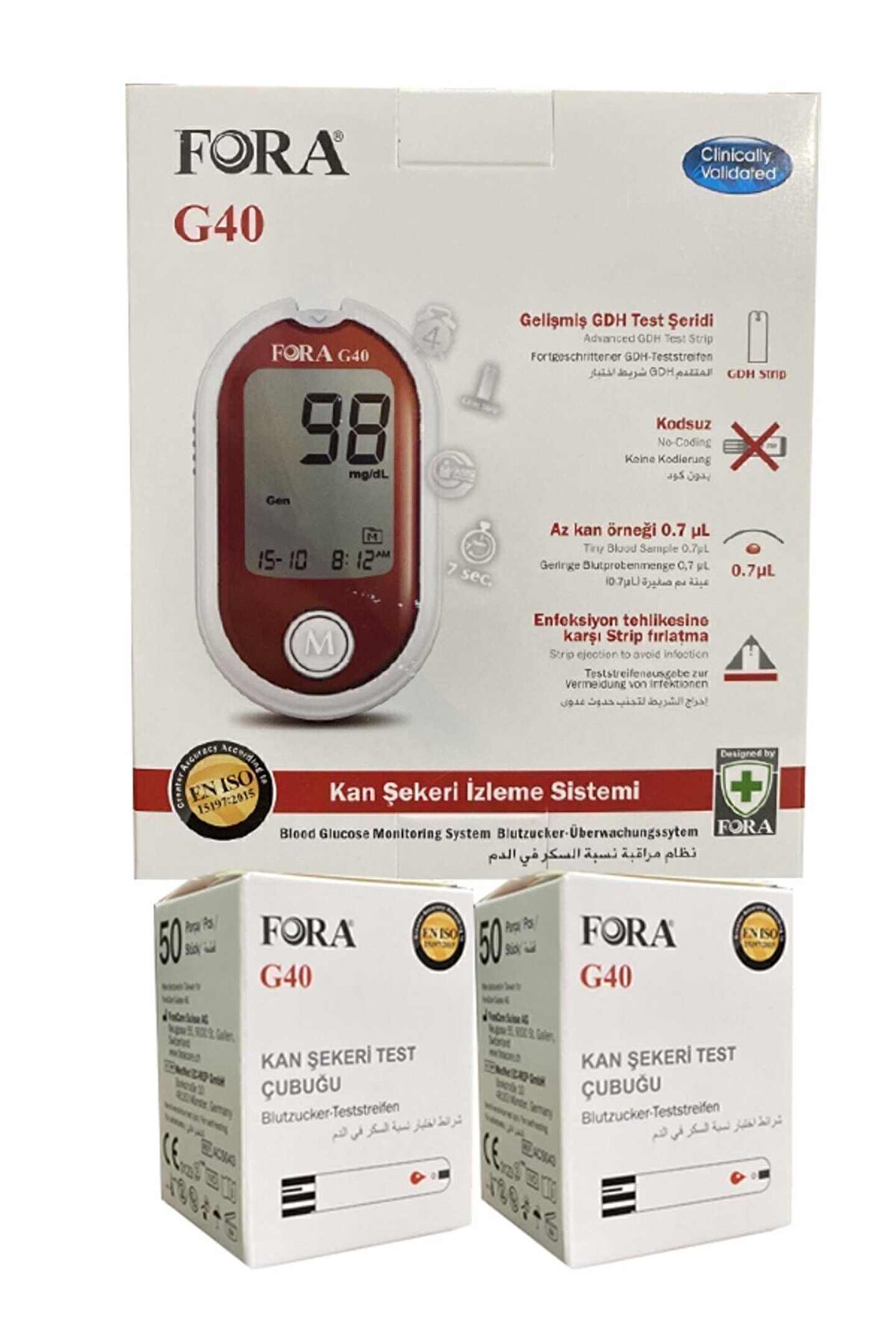 Fora G40 Diabet Şeker Ölçüm Cihazı ve Uyumlu Fora G40 50 Strip x 2 kutu En yeni Diabet ölçüm tekniği GDH teknolojisi ile güvendesiniz miadı 2026 haziran ayıdır