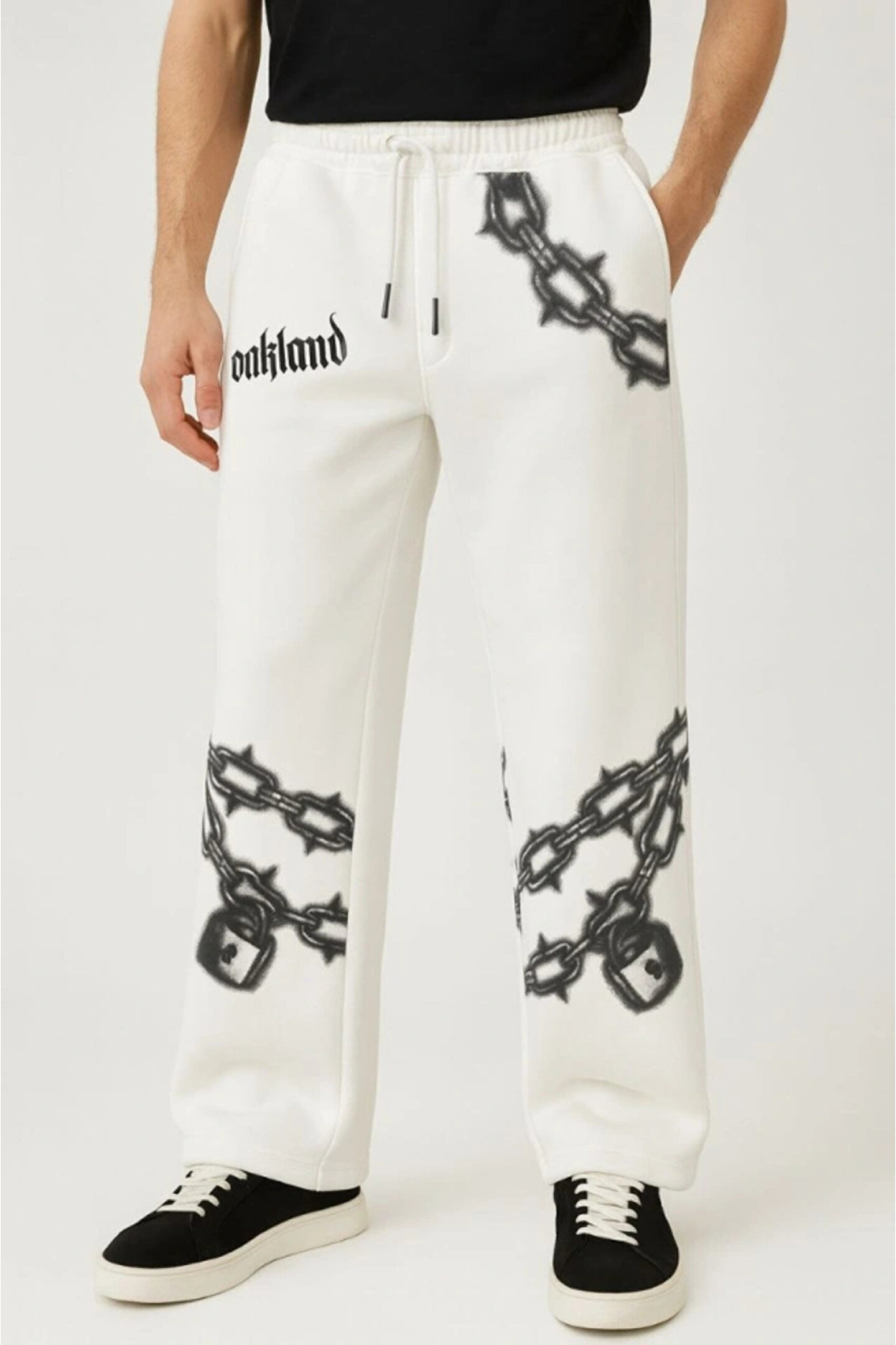 fourblack MDB Erkek Üç İplik Pamuklu Baskılı Cepli Jogger Buggy Pantalon Oversize Kalıp Beyaz