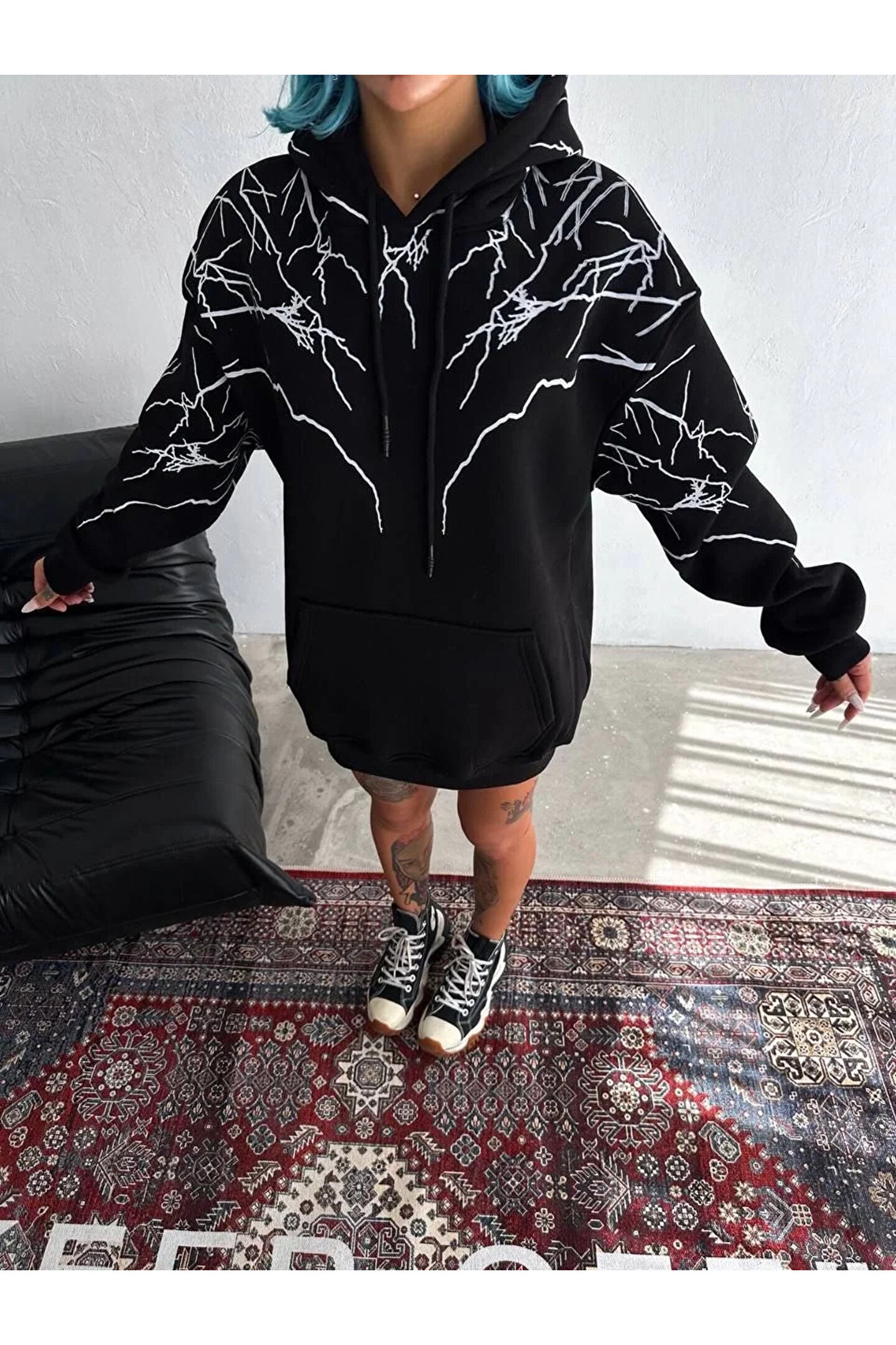 Yıldırım Baskılı Kapşonlu SweatShirt - Siyah