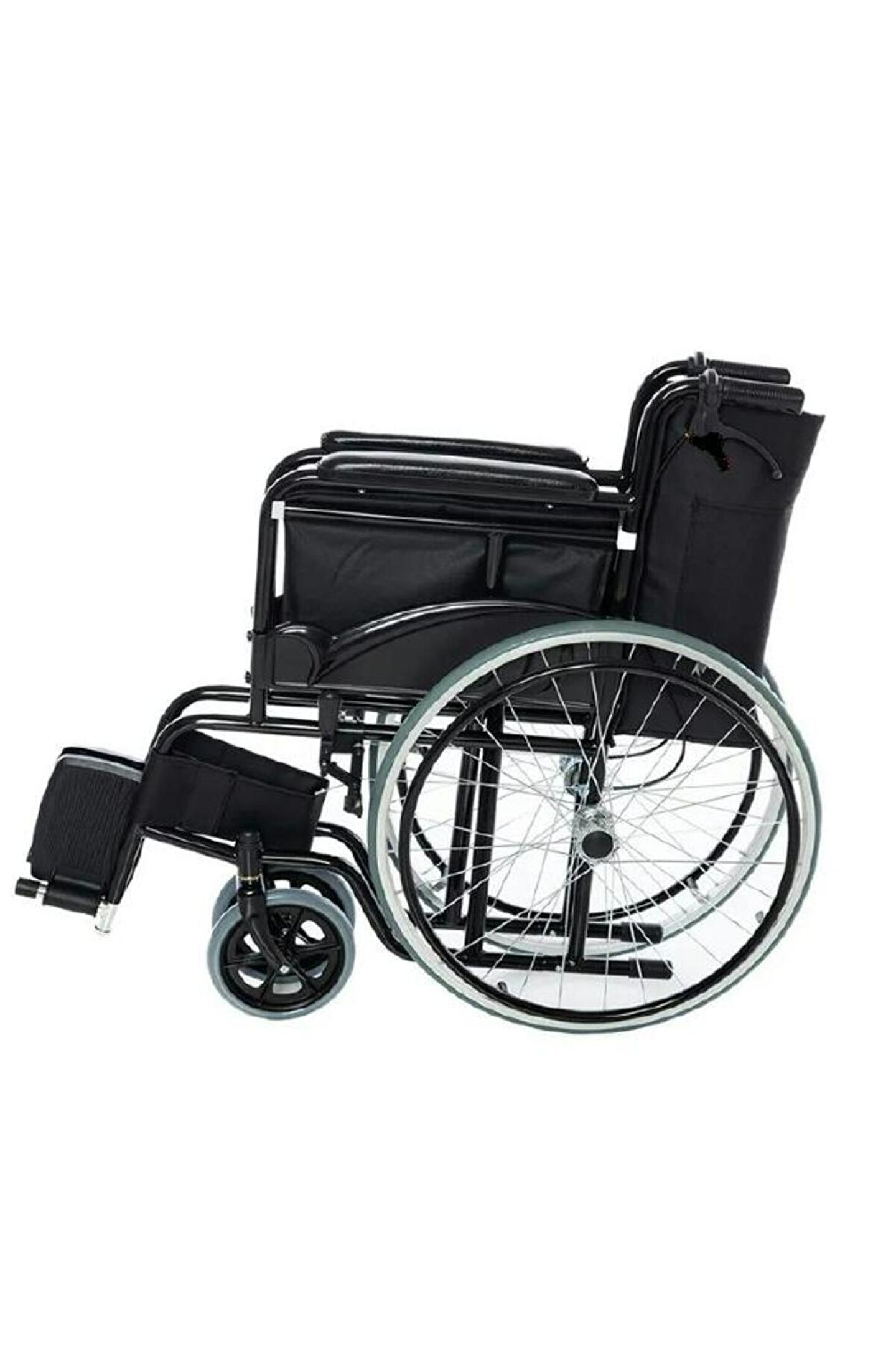Özellikler: Refakatçi Frenli, Manuel tekerlekli sandalye Karbon çelik şasi, elektrolizle yüzey işleme. ; Çelik tekerlek göbeği, poliüretan dolgu lastik. ; PVC ön tekerlek. ; Yüksek kaliteli paraşüt kumaş .;