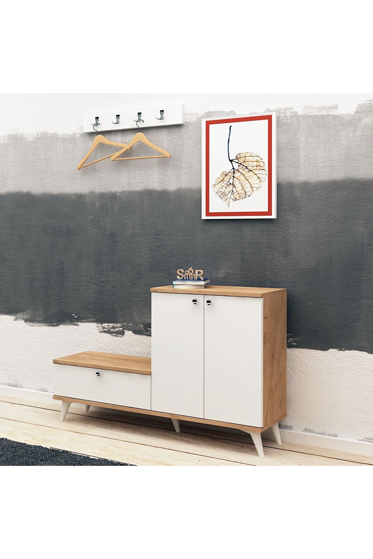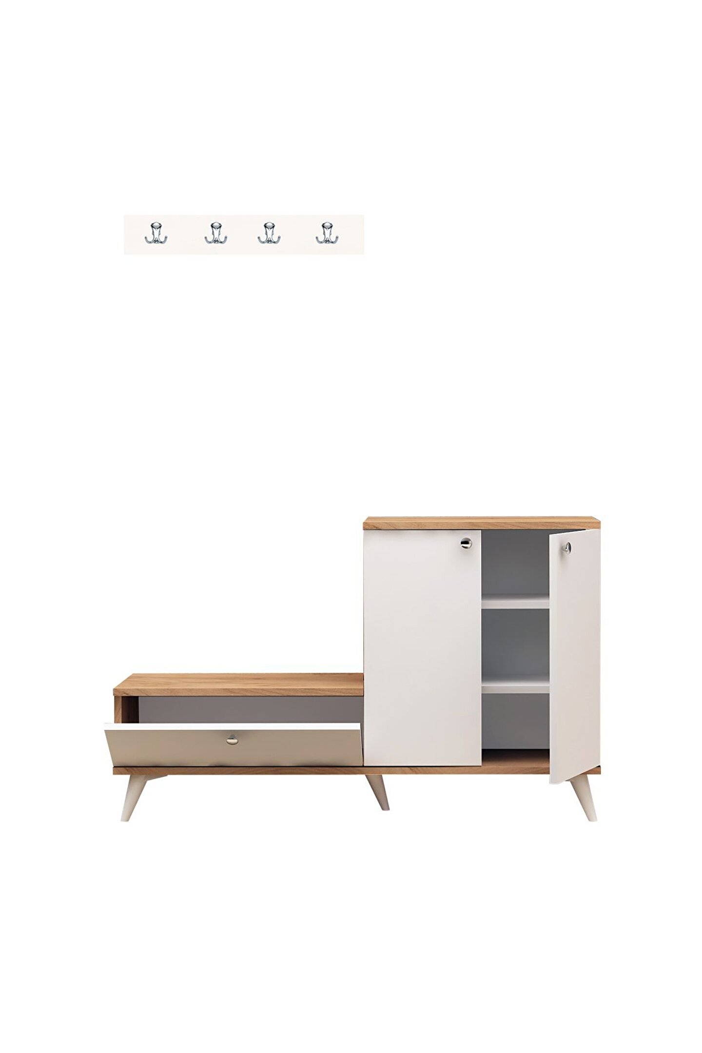 Askılık detayı da bulunan ayakkabılığın ölçüleri; yükseklik 76 cm, genişlik 120 cm ve derinlik 30 cm’dir.; Askılık ölçüleri; yükseklik 15 cm, genişlik 60 cm ve derinlik 1,8 cm’dir.; Ayakkabılık, zarif ve şık bir tasarıma sahip olup beyaz rengin zarafetiyle öne çıkar.; Ayakkabıların düzenli ve temiz bir şekilde saklanmasını sağlamak için özel olarak tasarlanmış olan ayakkabılık ve askılık takımı, ev girişlerine ferahlık ve düzen katar.; Beyaz rengin zarafetine meşe malzeme eklenerek doğal sıcaklık oluşur.; Meşe malzemenin sıcak tonları, ayakkabıların sergilenmesine estetik bir dokunuş katarken, beyaz renk de modern bir görünüm sağlar.; En üst düzey kalite standartlarına uygun olarak üretilerek içerisinde herhangi bir kanserojen madde bulundurmaz.; Anti-bakteriyel özellikleri sayesinde ayakkabıların hijyenik bir ortamda muhafaza etmeye yardımcı olur.; Çeşitli saklama seçenekleri sunan çok yönlü bir tasarıma sahiptir.; Dikey olarak tasarlanmış bir dolap, ayakkabıları sıralı ve düzenli bir şekilde saklamak için idealdir.; Böylelikle yerden tasarruf sağlar.; Yatay dolabı, ayakkabıları yan yana ve kolayca erişilebilir bir şekilde düzenlemeye olanak tanır.; Çift dolap sistemi, ihtiyaçlara ve evin düzenine uygun olarak ayakkabıları düzenli bir şekilde saklama esnekliği sunar.;
