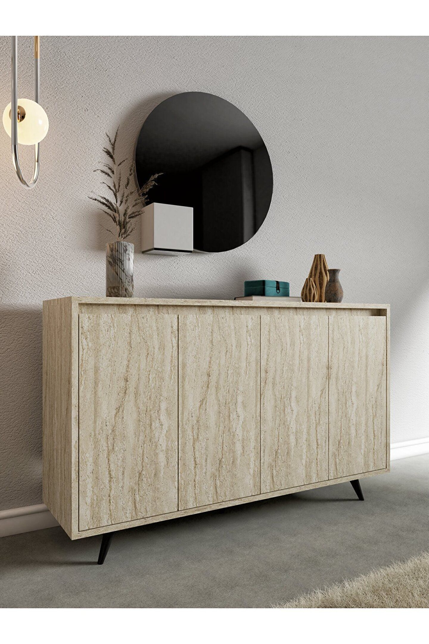 • Ürün gövdesi 18 mm kalınlığında Traverten renginde suntalam malzeme kullanılarak üretilmiştir. Yaşam alanlarına modern desenleriyle şıklık kazandırırken, kapalı ve açık bölmeleri ile depolama ihtiyacınızı giderebilecek niteliktedir.