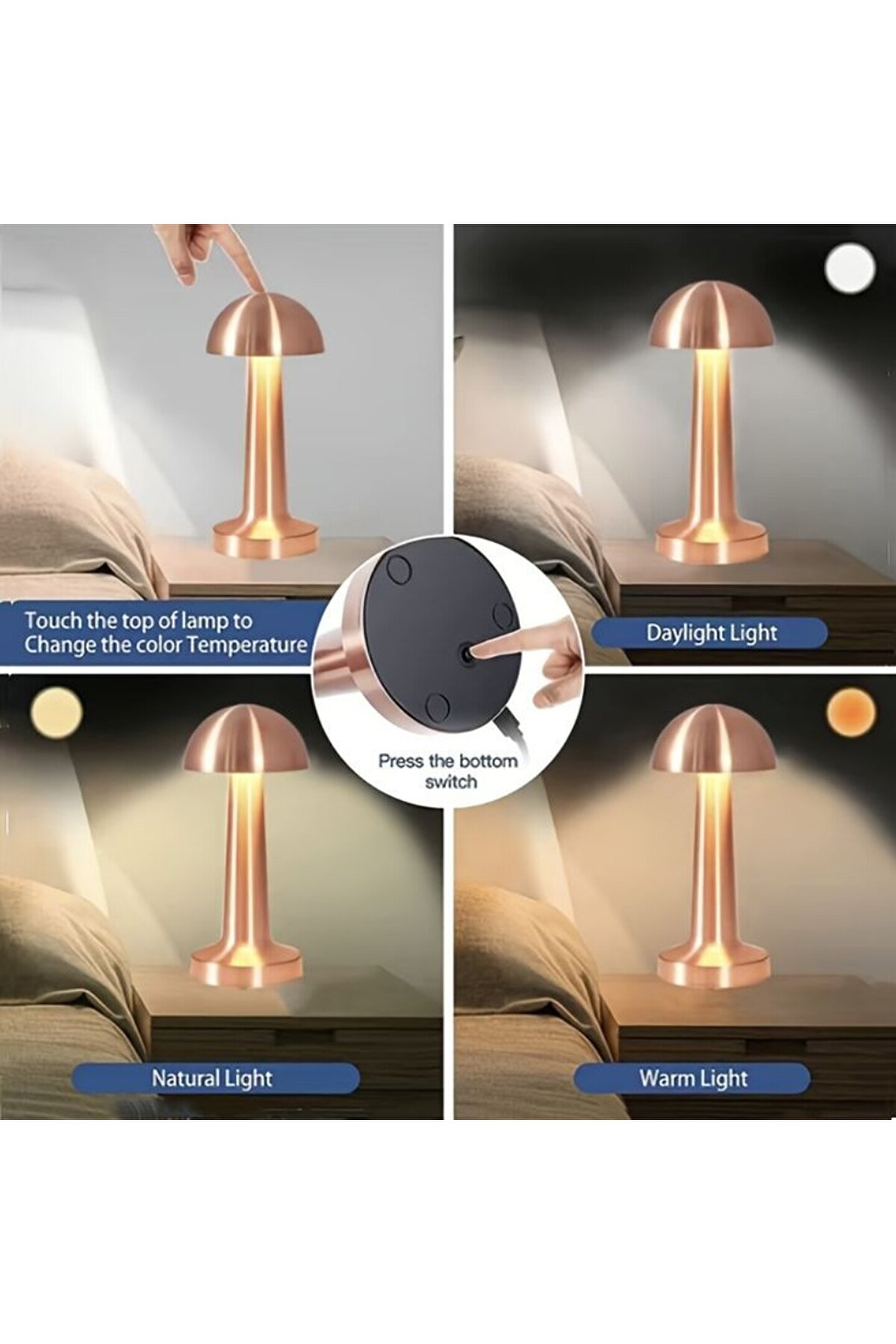 Ürün kullanımı: Ürünün altındaki güç düğmesini açın. Ürünün üst kısmındaki dokunmatik alana bir kez dokunduğunuzda zayıf ışık verir. İkinci kez dokunulduğunda orta ışık verir. Üçüncü kez dokunulduğunda güçlü ışık verir.