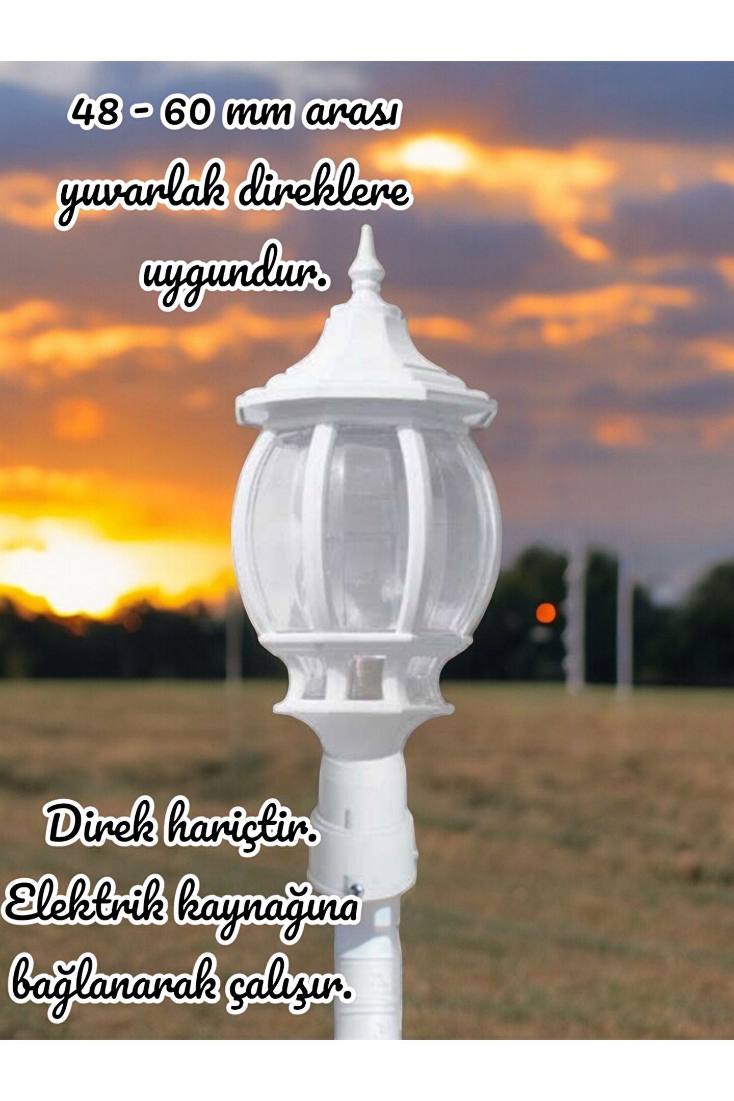 DİREK VE AMPUL HARİÇTİR. ; SADECE ARMATÜR FİYATIDIR. ; Ürünümüz elektrik kaynağına bağlanarak çalışır. ; Birinci kalite sert plastikten üretilmiştir. ; Yağmur, kar ve güneş gibi mevsimsel şartlardan etkilenmez. ; Sadece 48 - 60 MM arası yuvarlak direkler için uygundur. ; E27 Duyludur. ; Paket içeriğinde ampul yoktur. ; Ampul dahil ürünlerimiz için mağazamızı inceleyiniz. ; E27 Duy maksimum 26 watt led ampul takarak kullanabilirsiniz. ; Ürün Ölçüleri: Çap 20 Cm, Yükseklik 44 Cm. ; Aynı ürünün duvara montaj edilen, kare çim çit panel profili üzerine, tavana zincirli ve duvara set üstü olarak üretilmiş çeşitleri mağazamızda mevcuttur.;