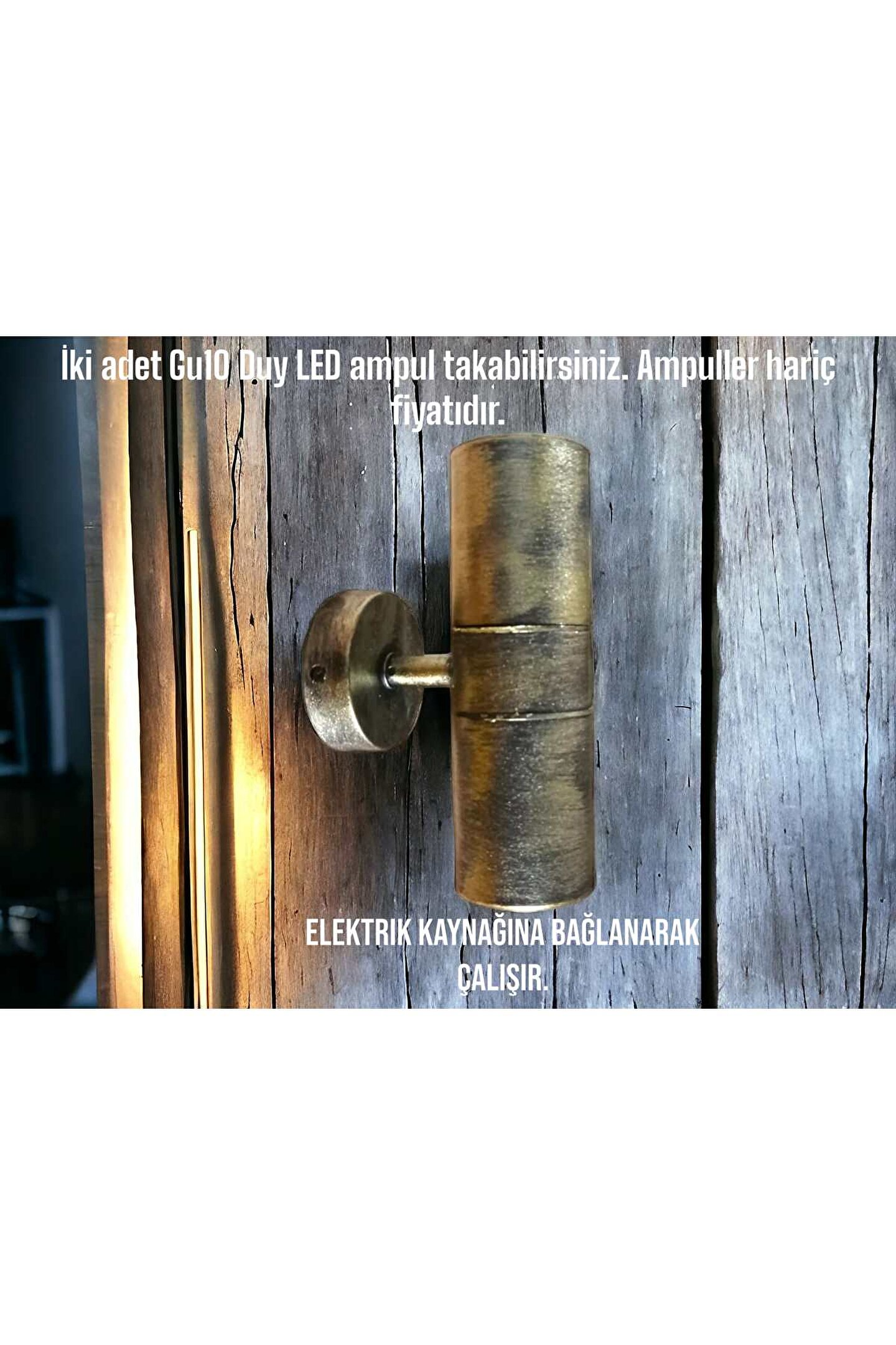 Antik Eskitme Çift Taraflı Plastik Kasa İç ve Dış Mekan Aplik, Bahçe Duvar Armatürü (Ampuller Hariç) Ürünümüz elektrik kaynağına bağlanarak çalışır. ; KESİNLİKLE pilli, şarzlı, güneş enerjili vs. ; DEĞİLDİR. ; Birinci kalite ABS plastik gövde el işçiliği ile boyanarak eskitilmiştir. ; İki adet Gu10 Duy Led ampul takarak kullanabilirsiniz. ; Paket içeriğinde ampul yoktur. ; Ampuller dahil ürünlerimiz ya da ampul için mağazamızı inceleyiniz. ; Max 2 x 7 Watt Gu10 Duy Led, IP 65 Koruma sınıfı, iç ve dış mekan aplik. ; Yağmur, kar ve güneş gibi mevsimsel şartlardan etkilenmez. ; Dolgun ve şık görünüm. ; Ürün Ölçüleri: Yükseklik 18,6 Cm, Dürbün Mercek çap: 6 cm, Derinlik: 11,5 Cm. ; montaj aparat çapı: 7,2 Cm. ; Antik Eskitme Çift Taraflı Plastik Kasa İç ve Dış Mekan Aplik, Bahçe Duvar Armatürü (Ampuller Hariç);
