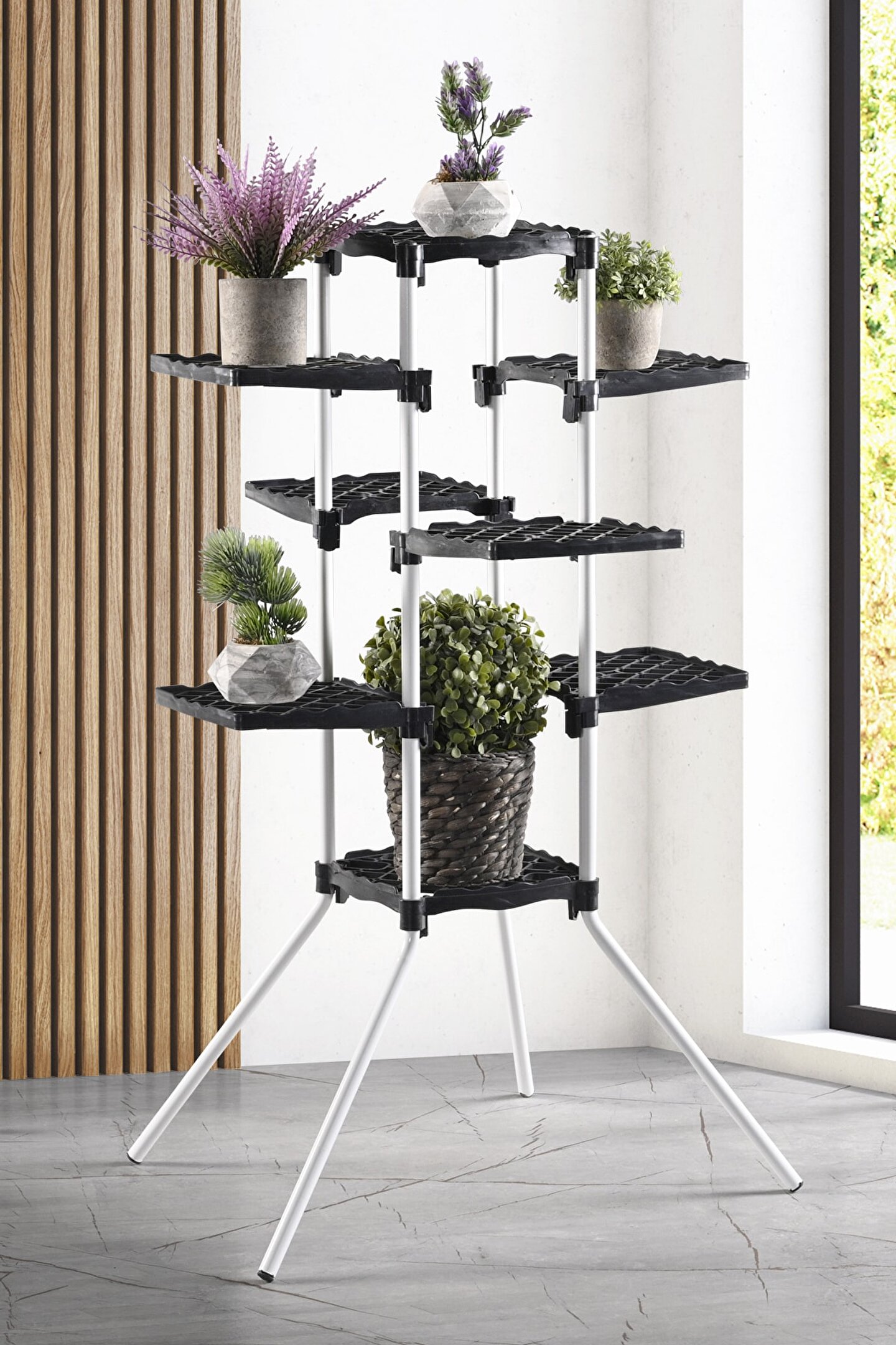 Modern tasarım, Kolay ve rahat kurulum Çiçeklerinizi bir arada daha düzenli ve daha güzel gösterir. Demonte olarak gönderilen ürünümüzün içerisinde kurulum esnasında gereken aparatlar eksiksiz olarak ürün kutusunun içinde mevcuttur. Ürün kurulumunu rahatça tamamlamanız için gerekli yönlendirmeleri içeren kılavuz kutu içeriğindedir. Kendi tasarımımız olan ürünümüz 20 cm çapa kadar saksılara sahip çiçeklerinizi salonunuzda, balkonunuzda, terasınızda vb. alanlarda oldukça şık bir şekilde barındıracaktır. Stantların her birinin 4 kg taşıma kapasitesi vardır. Ürün içeriği: 4 adet metal ayak, 2 adet ayakları birleştirici plastik stant, 6 adet yan plastik stant, 8 adet plastik tapa, 24 adet stant sabitleyici kilit. Kolay kurulum kılavuzu Ürünümüzün ayakları elektrostatik toz boyalı metal borudan, çiçek konulan stant kısımları ise sağlam plastikten üretilmiştir. Ürün Ölçüleri: Genişlik: 55cm x 55cm Yükseklik: 93,5cm 1 adet Raf öçüsü: 20 X 20 Cm; Yedek kilit olması için fazladan stant sabitleyici kilit gönderilmektedir. ; Ürünümüz metal - plastik kombindir. Ayaklar metal, raflar birinci kalite plastiktir. ; Ürün ağırlığı 2,5 kg'dır. ;