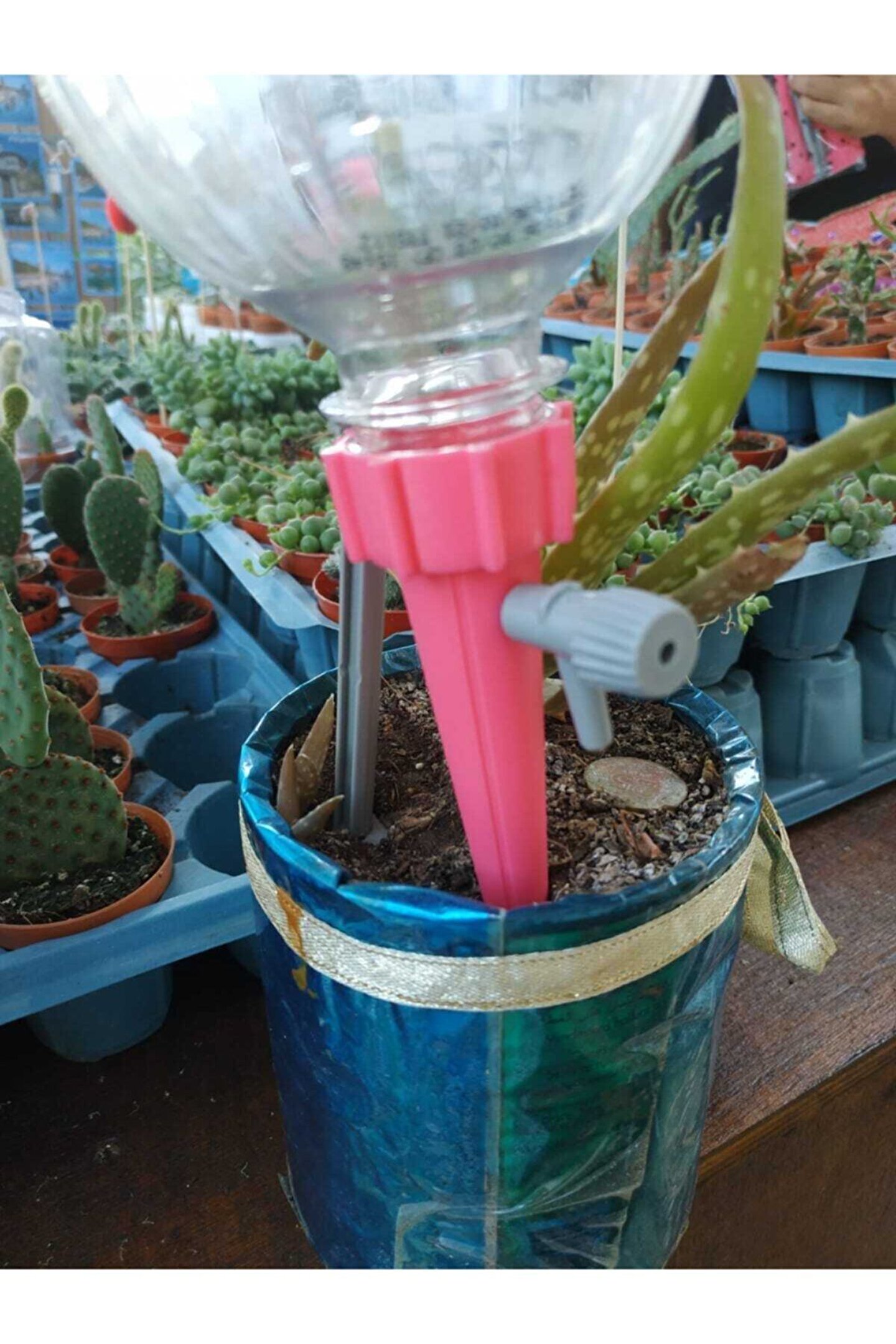 Tatile çıktığınızda çiçekleriniz susuz kalmayacak! Sevdiklerinizin kabristanlarındaki çiçekler solmayacak. Bu ürün FULL REYON tarafından gönderilecektir. Piyasadaki tüm gazlı içeceklerin şişelerine uyumludur. ŞİŞE KAPAKLARININ ALTINDAKİ HALKAYI KOPARMAYI VE HAVA ALIP DAMLAMA YAPABİLMESİ İÇİN ŞİŞE DİBİNDE DELİK AÇMAYI UNUTMAYIN! ; Şişe Ebadına Göre 30 Güne Kadar Çiçek Ve Bitkilerinizi Sulayabilirsiniz.; ; Şişe İçeriğine Vitamin Vb. Ek Takviyeler Eklenebilir.; ; Zaman Ayarı Yapabildiğiniz Musluklu Model Sayesinde Siz Evde Yokken Bitkilerinizi Düşünmenize Gerek Kalmayacak.; ; Yanında Gönderdiğimiz Destek Sayesinde Büyük Şişeleriniz Devrilmeden Sabit Durmasını Sağlar.; ; 1 Adet Siparişinizde 10 Adet Gönderilir.; ; Renkler Stok Durumuna Göre Karışık Gönderilmektedir; ; Paket içeriği: 10 Adet Sulama Aparatı, 10 Adet Musluk, 10 Adet Destek Aparatı. Kullanıma hazır olarak gönderilecektir. ; Not: Kullanılan şişelere İğne Vasıtasıyla 1 Adet Delik Açarak Hava Almasını Ve damlamasını Sağlamalısınız.; ; Kampanya fiyatından satılmak üzere 100 adetten fazla stok sunulmuştur.; İncelemiş olduğunuz ürünün satış fiyatını satıcı belirlemektedir.;