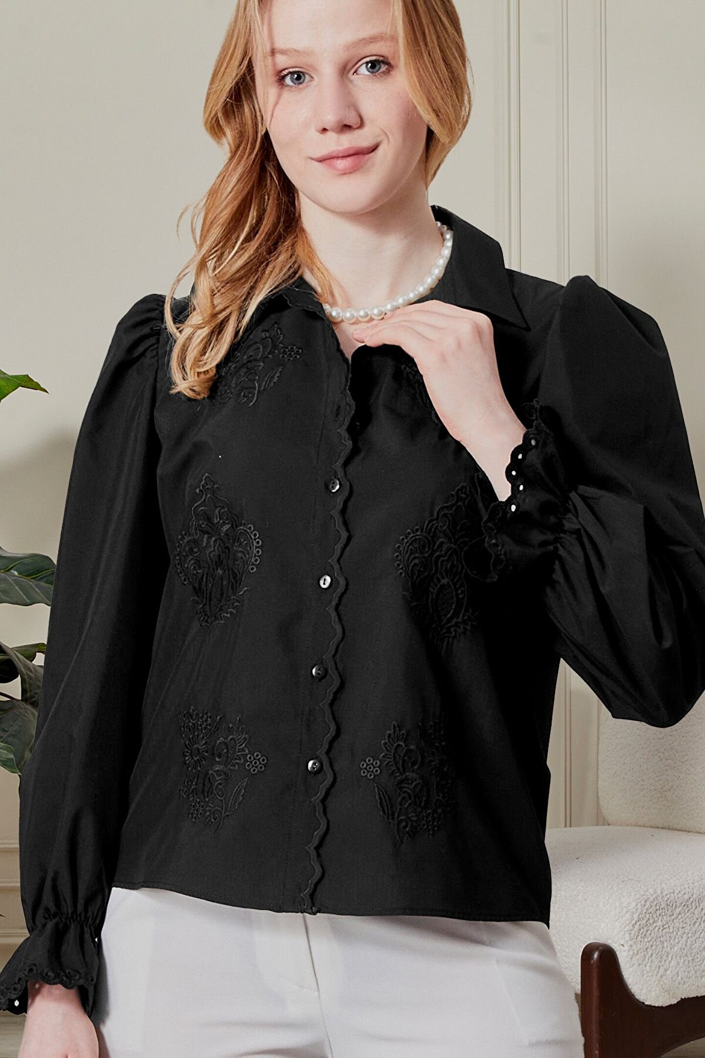 Kadın Siyah Fisto Detaylı Vintage Nakışlı Gömlek