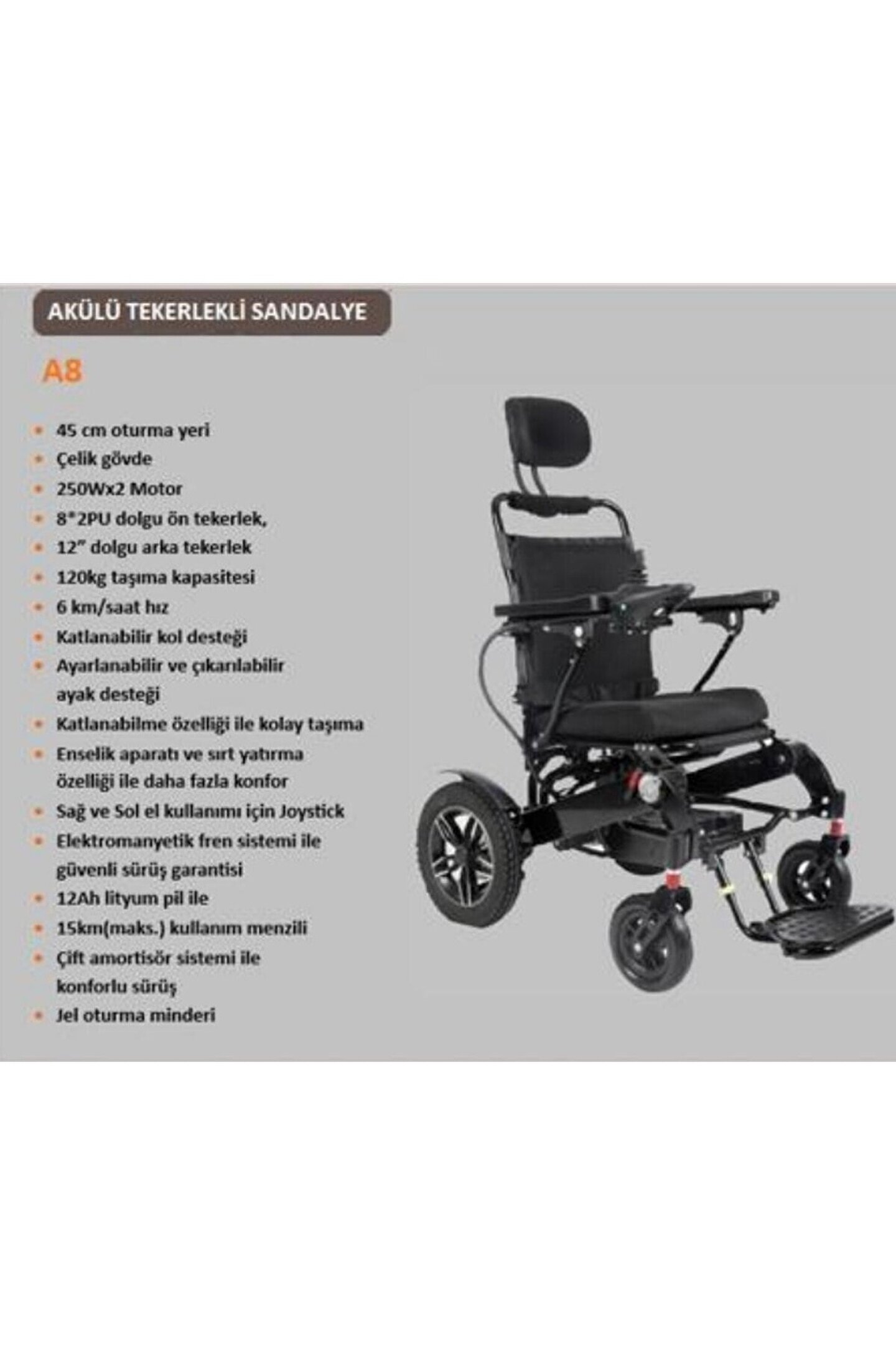 120 Kg taşıma kapasitesi 45 cm oturma yeri Jel oturma minderi Çift amortisör sistemi ile konforlu sürüş Esneklik aparatı ve sırt yatırma özelliği ile daha konforlu Ayarlanabilir ve çıkarılabilir ayak desteği Sağ veya sol el ile kullanılabilir joystick Katlanabilir kol desteği Elektromanyetik fren sistemi ile güvenli sürüş Katlanabilir özelliği ile kolay taşıma Çelik gövde 250 Watt x 2 adet motor 8 inç ( 20 cm ) Poliüretan dolgu ön teker 12 inç ( 30 cm ) Poliüretan dolgu arka teker 6 Km / Saat hız 12 Ah lityum pil 15 Km ( max; ) kullanım menzili;