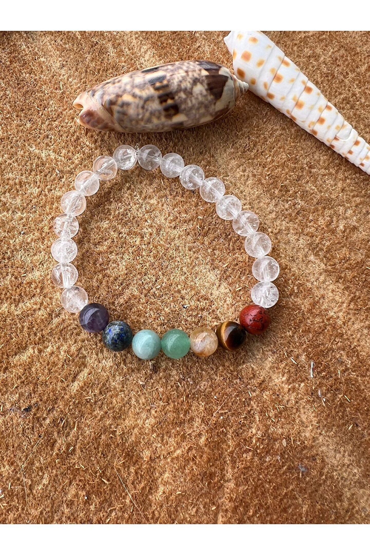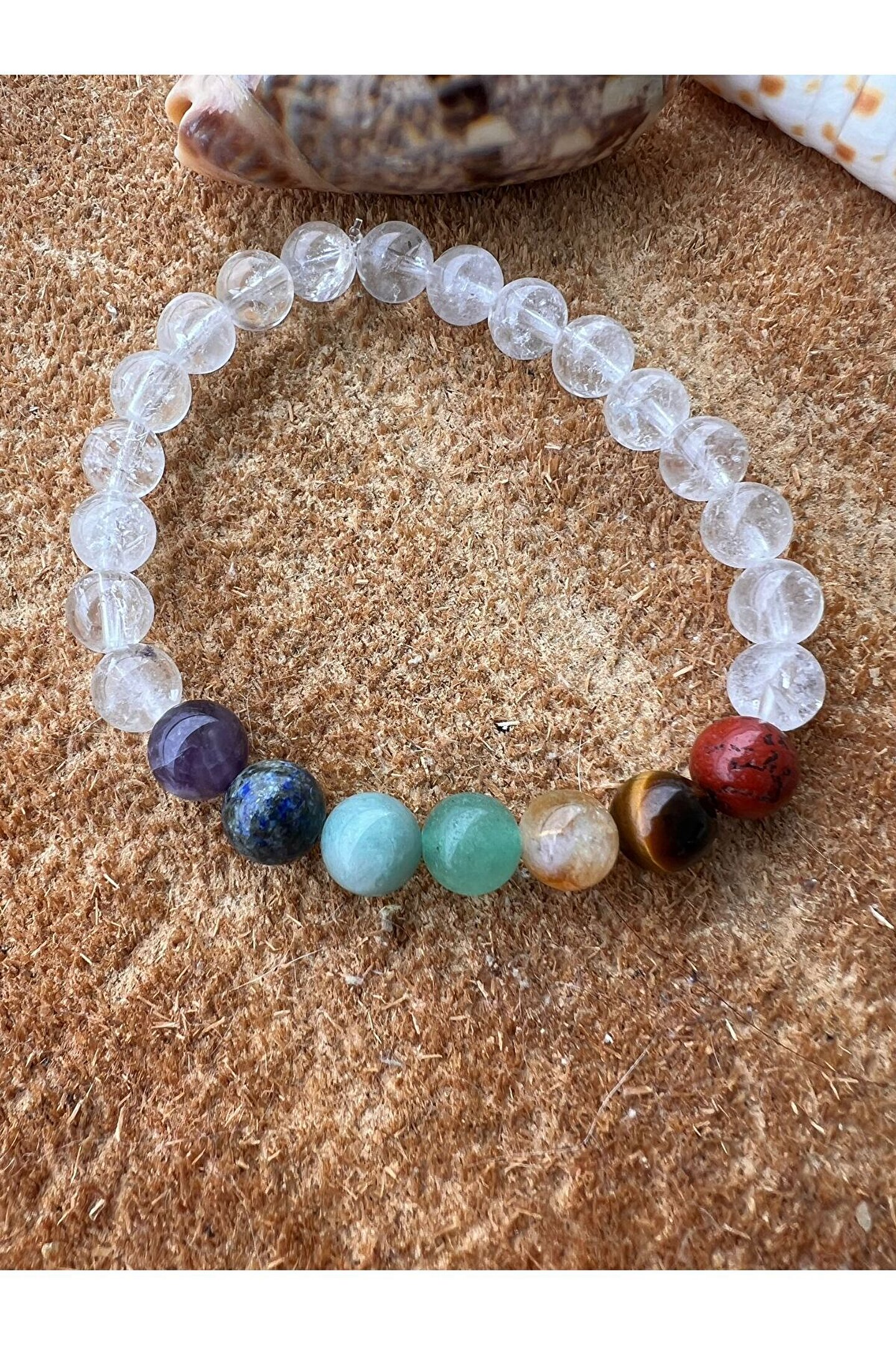 Yedi farklı doğal taş türünü bir araya getiren bu bileklik, her bir taşıyla farklı bir enerji ve şifa kaynağı sunar; Kristal kuvars, Jasper, Kaplan Gözü, Sitrin, Aventurin, Amazonit ve Lapis Lazuli gibi değerli taşlar, bilekliğin her parçasında benzersiz bir güzellik ve anlam katıyor; Doğal taş materyali sayesinde, her bileklik benzersiz ve otantik bir görünüm sergilerken, cildinizle doğal bir uyum sağlar; Bu bileklik, sadece estetik bir aksesuar değil; aynı zamanda enerji dengesi ve kişisel gelişim için de ideal bir araçtır;