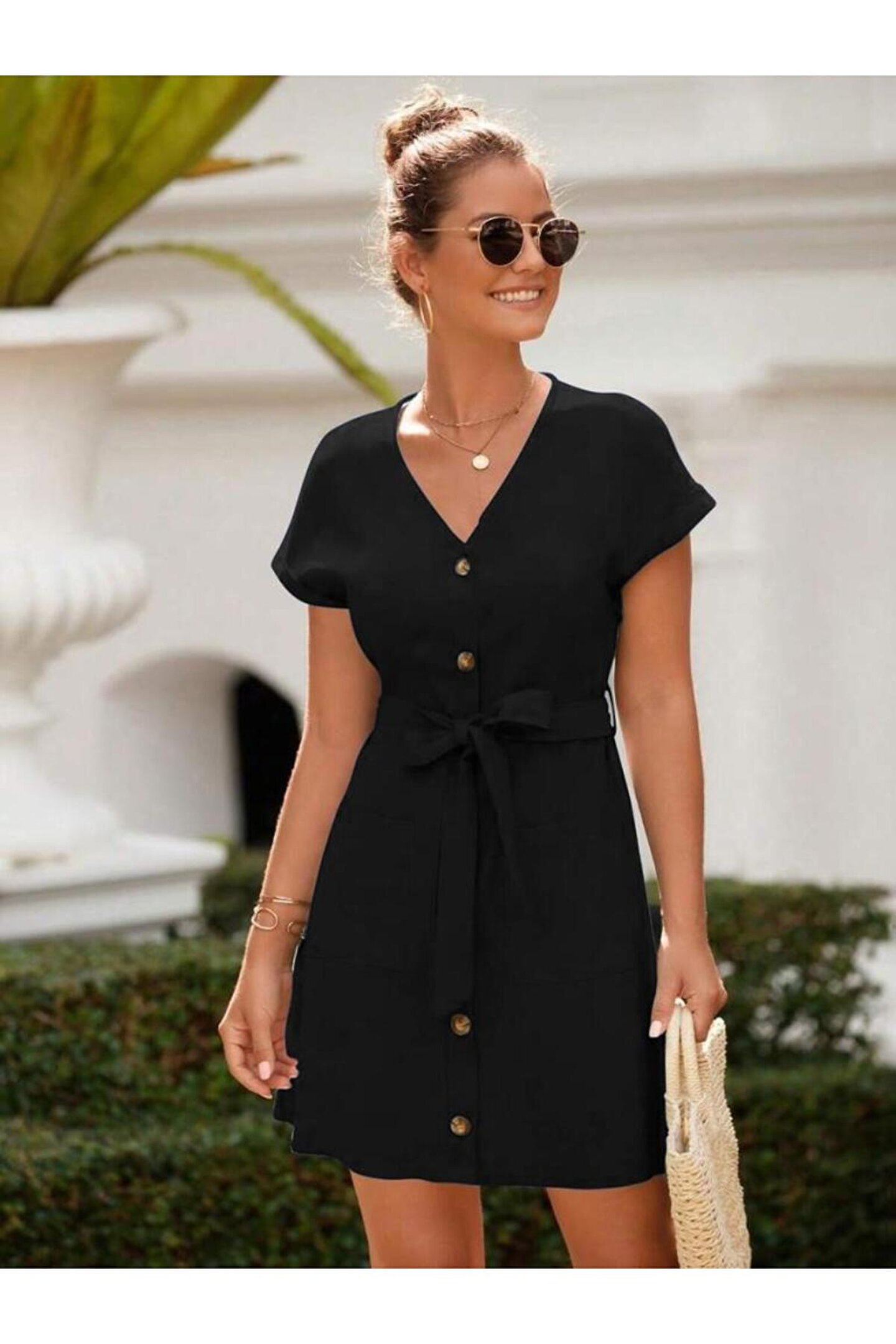 GE TİCARET Kadın Kısa Kollu V Yakalı önden Düğmeli Belden Kuşaklı Cepli Sofya Elbise