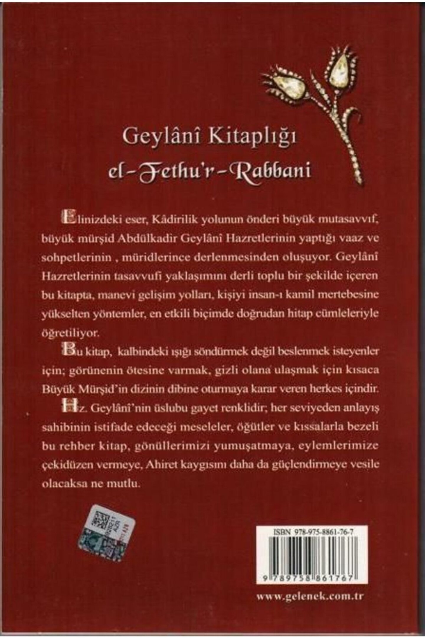 15x22 cm; ebat 407 sayfa 2; hamur kitap kağıdı karton kapak EL; FETHUR RABBANİ ALEMLERİN ANAHTARI, Abdulkadir Geylani sohbetler, karton kapak, 15x22 cm; Gelenek Yayınevi, 9789758861767 Bu eser, Kadirilik tarikatı yolunun önderi büyük mutasavvıf, büyük mürşid Abdülkadir Geylani Hazretlerinin yaptığı vaaz ve sohbetlerin, müridlerince derlenmesinden meydana gelmiştir; Abdulkadir Geylani Hazretlerinin tasavvufi yaklaşımını derli toplu bir şekilde anlatan bu kitapta, manevi gelişim yolları, kişiyi insan; ı kamil mertebesine yükselten davranışlar, en etkili biçimde doğrudan hitap cümleleriyle okuyucuya sunuluyor; Bu kitap, kalbindeki ışığı söndürmek değil beslemek isteyenler için, görünenin ötesine varmak için, gizli olana ulaşmak için, kısaca Büyük Mürşid'in dizinin dibine oturmaya karar veren herkes içindir; Tanıtım Yazısı: M; U; ;;