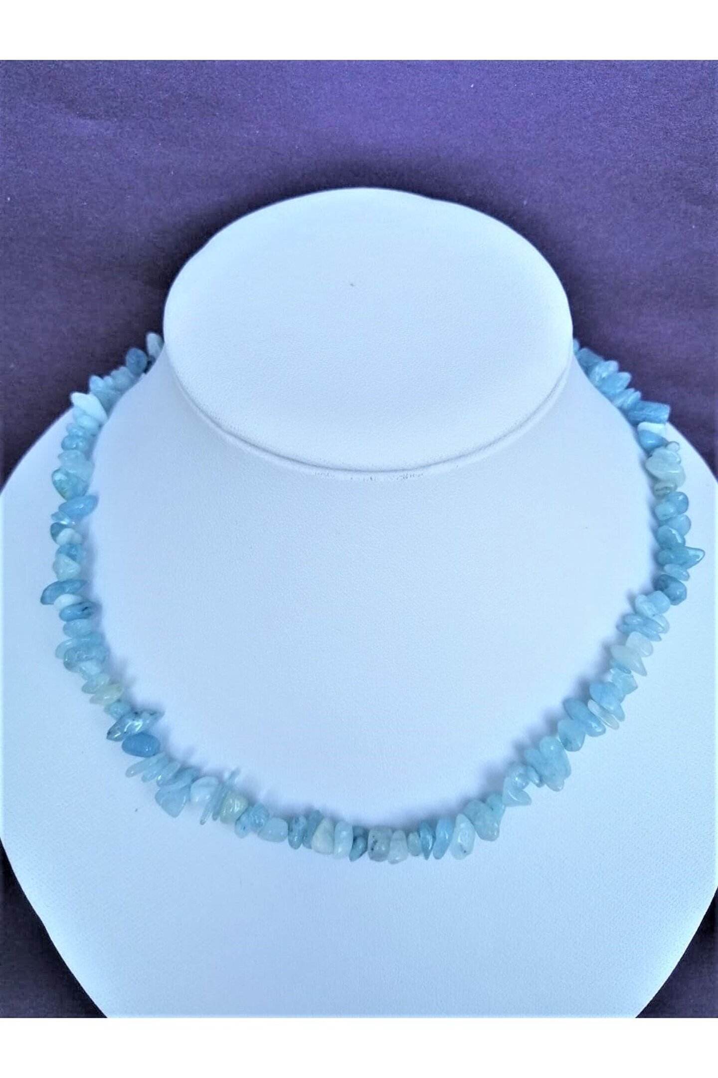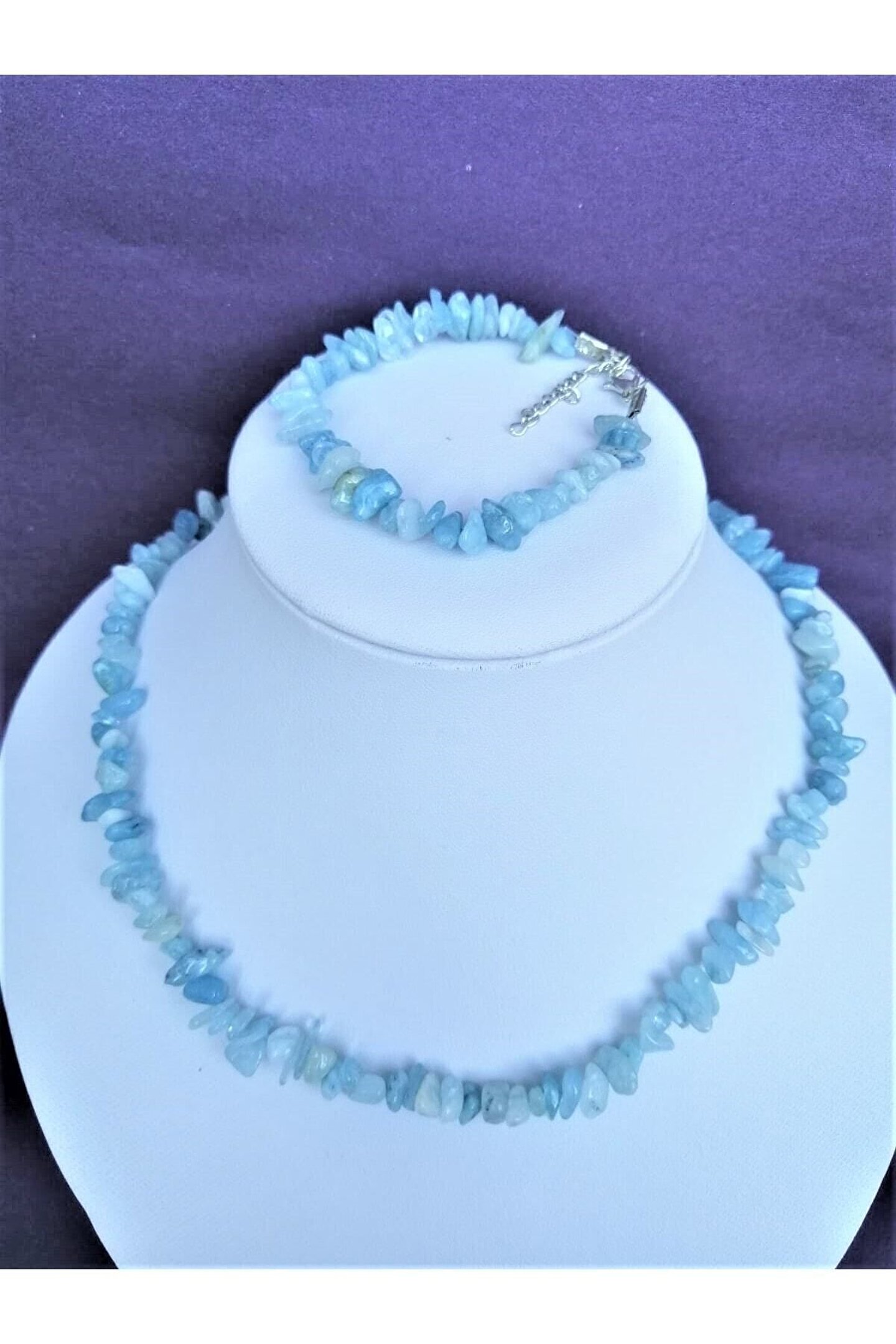 Doğal taş kullanımı sayesinde her parça benzersiz ve otantik bir görünüm sunar; Akuamarin taşı, hem kolye hem de bileklikte kullanılarak şıklığınızı tamamlayıcı bir aksesuar oluşturur; Kırık doğaltaş tasarımı, modern ve trend bir stil ifade ederken, aynı zamanda doğanın güzelliklerini yansıtır; Akuamarin'in parlak mavi tonu, enerjik ve canlı bir görünüm sağlar;