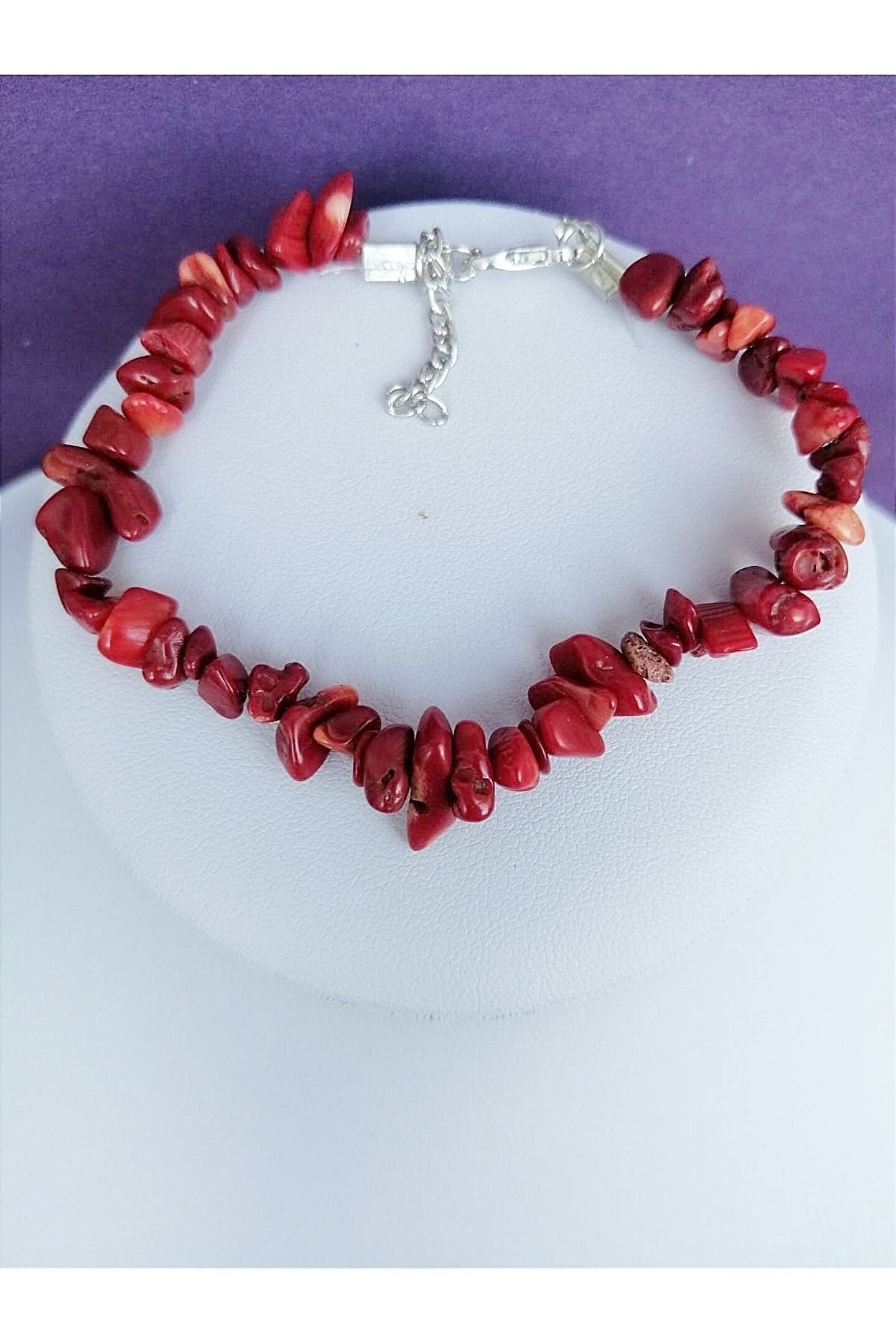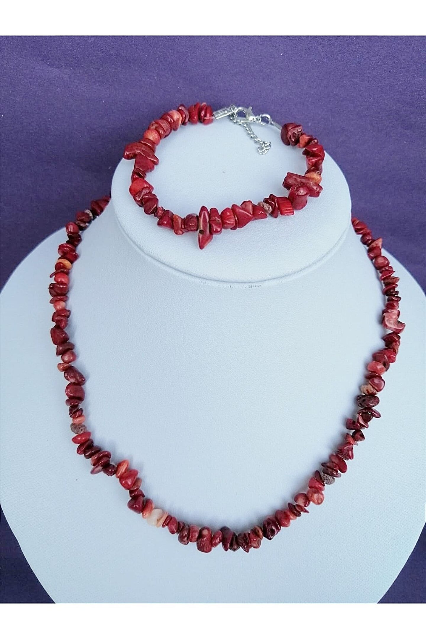 Gena stone Kırmızı Mercan Kolye Bileklik Set - Doğaltaş Takı - Gerçek Kırmızı Mercan Kırık Doğaltaş