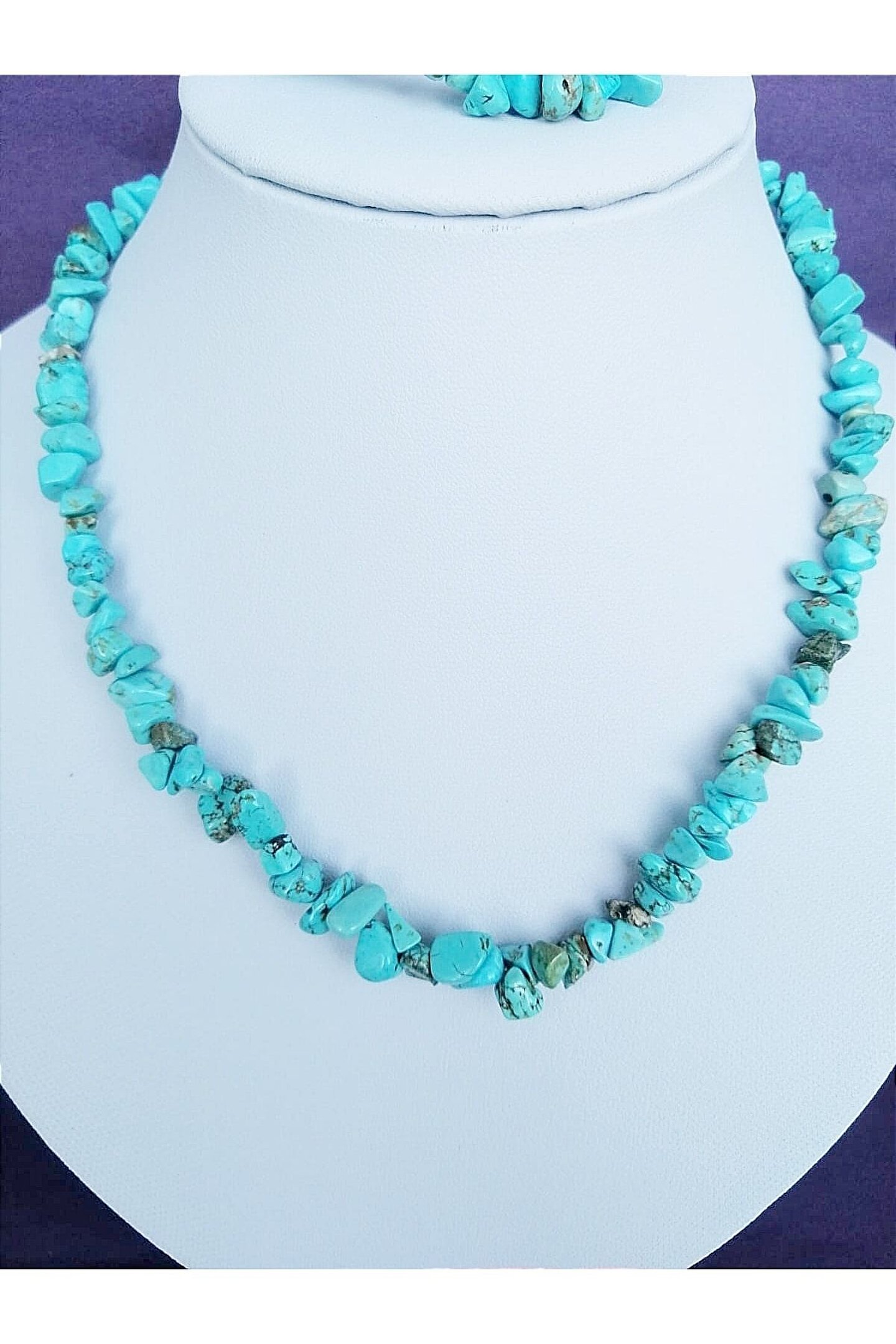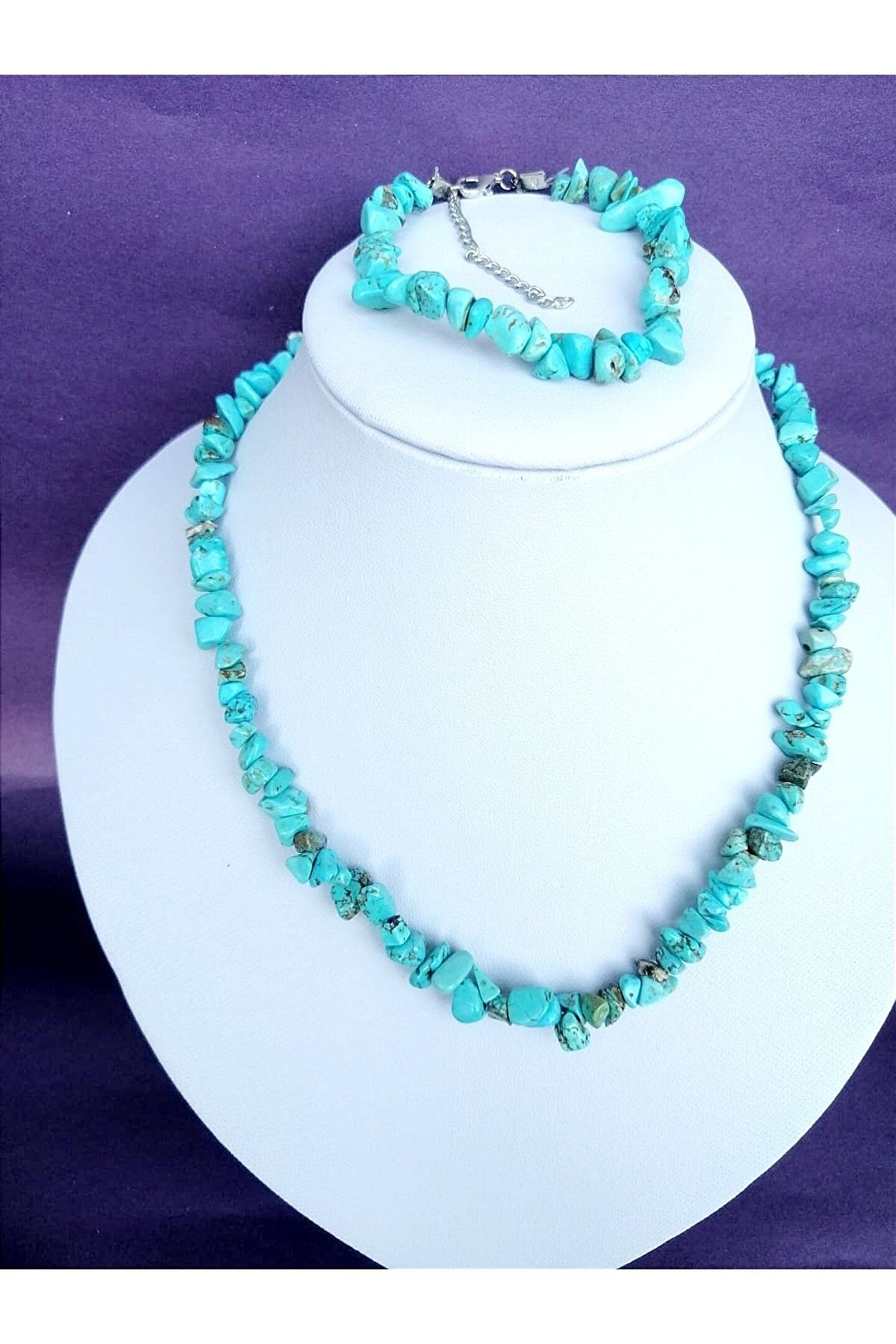 Doğal turkuaz taş kullanılarak tasarlanmış, her bir parçasında benzersiz desenler ve renk tonları bulunan kolye ve bileklik seti; Gerçek kırık turkuaz taşı ile üretilmiş, bu sayede her bir parça eşsiz bir karaktere sahip; Bijuteri takı severler için ideal bir seçim olan bu set, hem şıklığı hem de doğallığı bir arada sunar; Doğal taşların zarifliğiyle öne çıkan bu takım, günlük kullanım için mükemmel bir aksesuar alternatifi oluşturur;