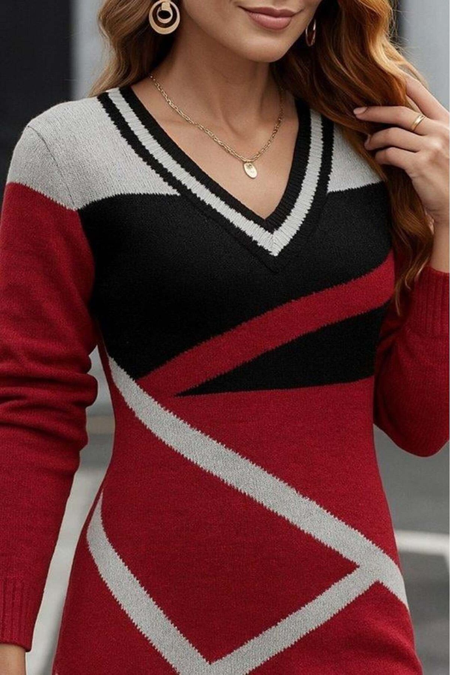 Kadın Uzun Kollu V Yakalı Kısa Triko Elbise