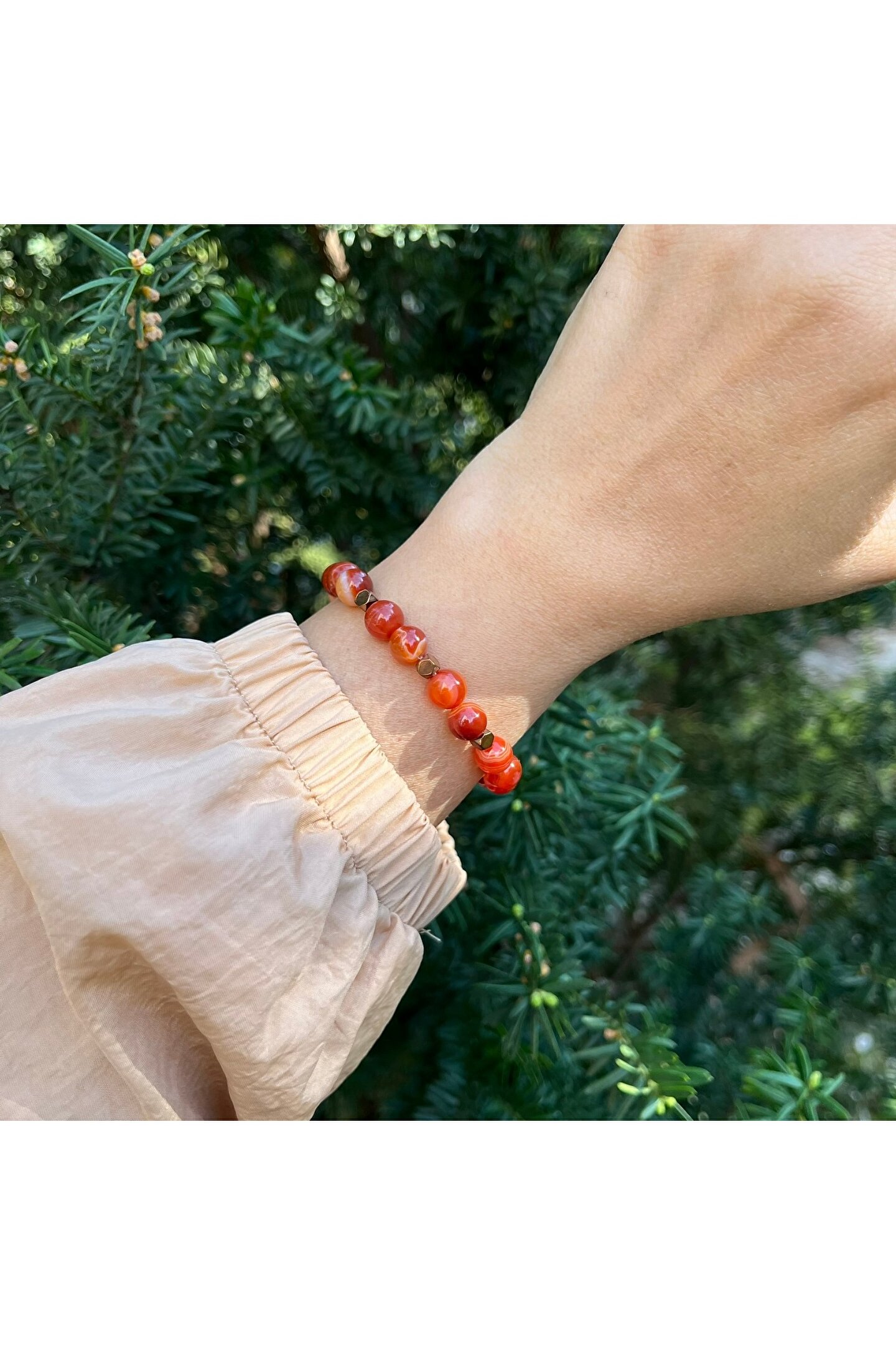 Doğal taş bileklik, karnelyan akik ve hematit taşlarının eşsiz güzelliğini yansıtır; 8 mm kalınlığındaki bu bileklik, zarif ve şık bir aksesuar olarak günlük kullanım için idealdir; Doğal taş materyali sayesinde her bilek boyutuna uyum sağlar ve konforlu bir kullanım sunar; Hem karnelyan akik hem de hematit taşları, bilekliğe benzersiz bir parlaklık ve renk tonu kazandırır;