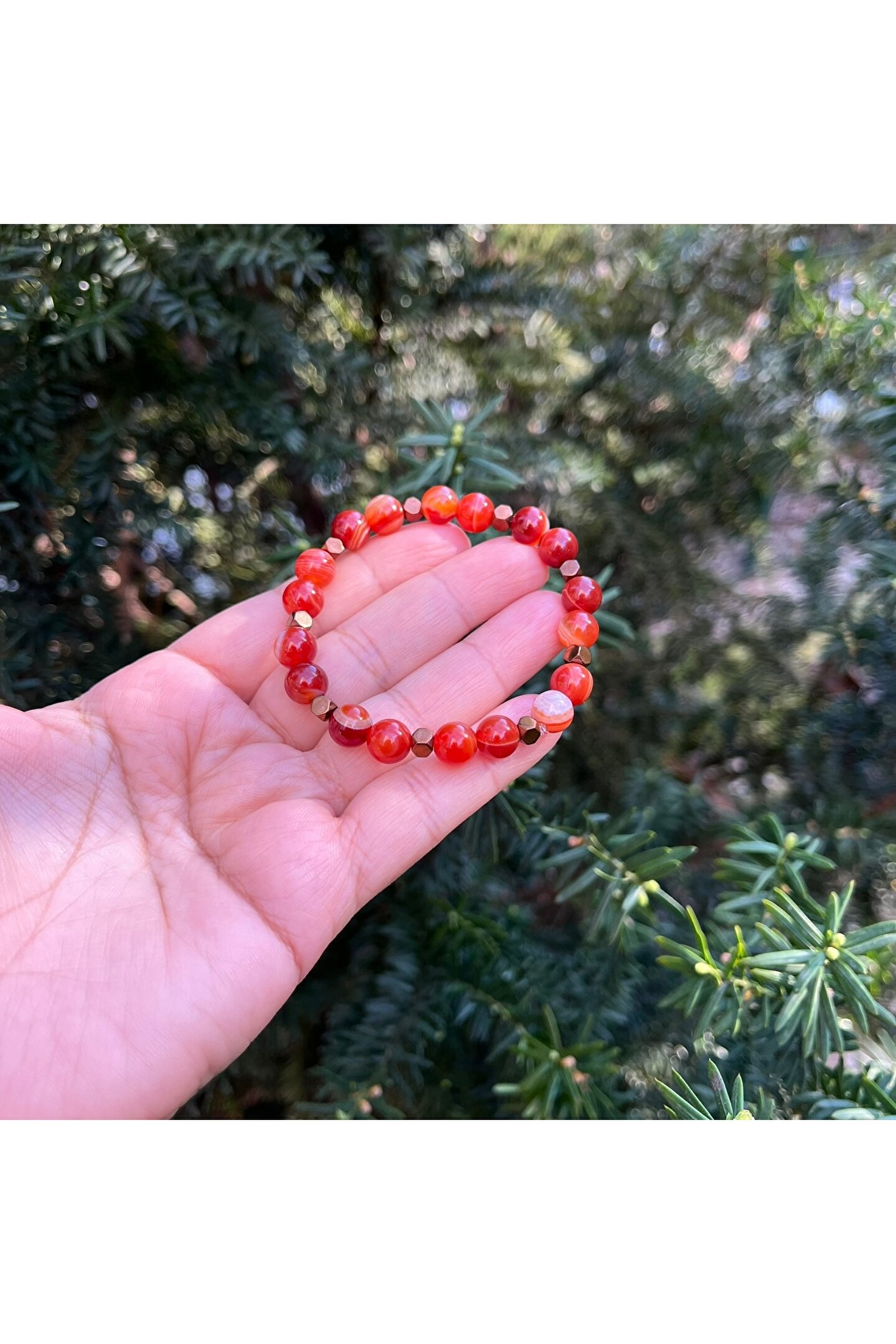 Doğal taş bileklik, karnelyan akik ve hematit taşlarının eşsiz güzelliğini yansıtır; 8 mm kalınlığındaki bu bileklik, zarif ve şık bir aksesuar olarak günlük kullanım için idealdir; Doğal taş materyali sayesinde her bilek boyutuna uyum sağlar ve konforlu bir kullanım sunar; Hem karnelyan akik hem de hematit taşları, bilekliğe benzersiz bir parlaklık ve renk tonu kazandırır;