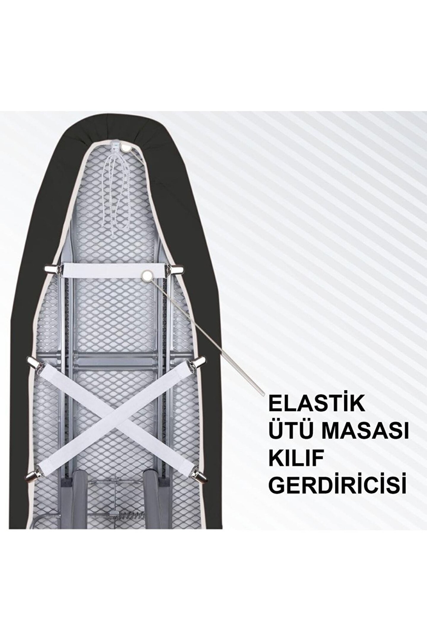 Premium Ütü Masası Kılıfı ***** 55x150 cm ebatlarıyla her tip ütü masadına uyar.; ***** 3MM kalınlığında özel keçe lamineli özel dokuma , 230 derece ısıya dayanıklı RENK VERMEZ kumaş ***** Zor aşınan uzun ömürlü kumaş ***** Hızlı ütülemeyin kolaylaştıran ve süzülerek gitmeyi sağlayan kaygan yüzey ***** Ütüleme süresini en aza indiren kumaş ***** Kilitli İp Sistemiyle Kılıf istenilen sistem tutma ve kaymayı önleme ***** %100 Polyester GERCELLA ELASTİK ÜTÜ MASASI GERDİRİCİSİ ***** Uzunluk :20cmx1 adet,25 cm x 3 adet ***** Genişlik:3cm ***** Ürün Açıklaması: *****1)20-25 cm arasında kademesiz olarak 35-55 cm arasında ayarlanabilir ***** Streç uzunluğu: 35-55 cm ***** 2)[ÇOK YÖNLÜ] :ÜTÜ MASASI KILIFLARI,KOLTUK KILIFLARI, MASAÖRTÜLERİ, ARAÇ KOLTUKLARI VB İÇİN İDEALDİR.; ***** 3) [SAĞLAM]: SAĞLAM METAL KLİPSLER VE SAĞLAM LASTİK BANTLARDAN ÜRETİLMİŞTİR,BÖYLECE ÜTÜ MASASI KILIF YÜZEYİ GERGİN VE KIRIŞIKSIZDIR.; ÜRÜN DAYANAKLIDIR.; ***** 4) [KORUYUCU]:KUMAŞI HASARLARA KARŞI KORUYAN ENTEGRE PLASTİK KISKAÇ SİSTEMİ VARDIR.