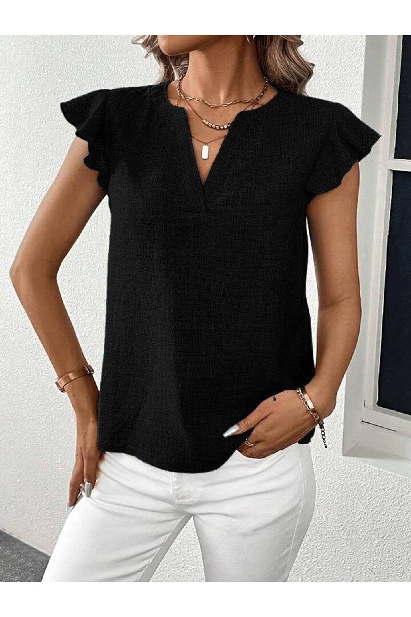 Kadın Kısa Kelebek Kollu V Yakalı Bluz