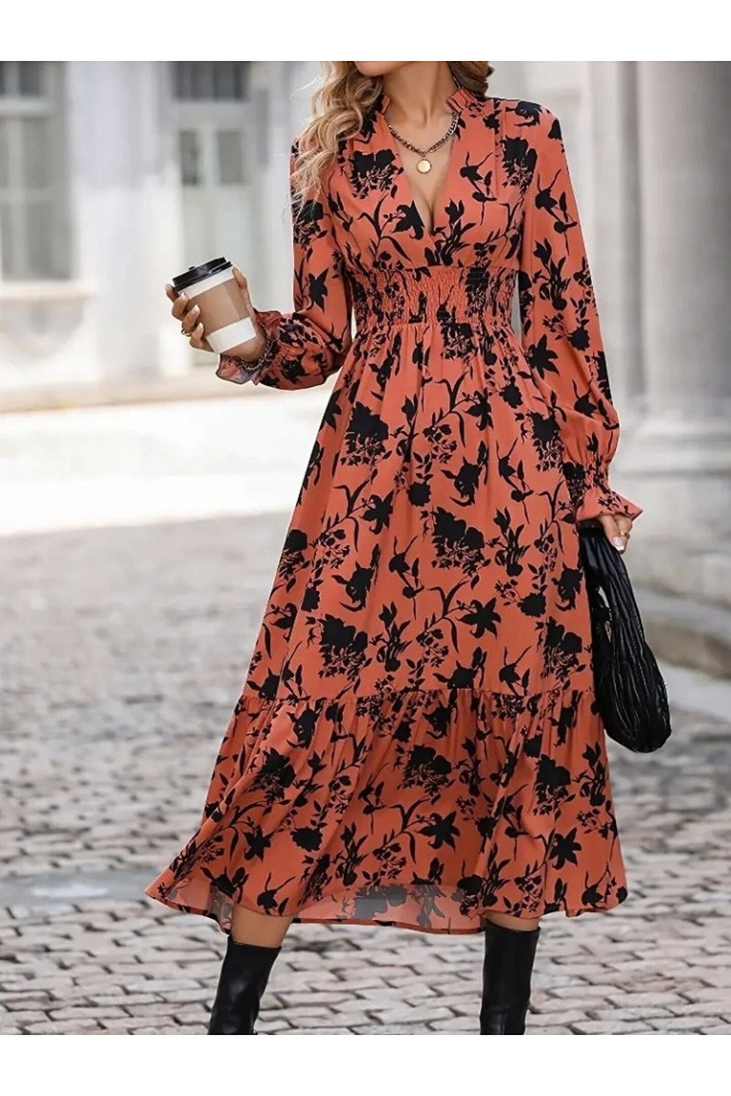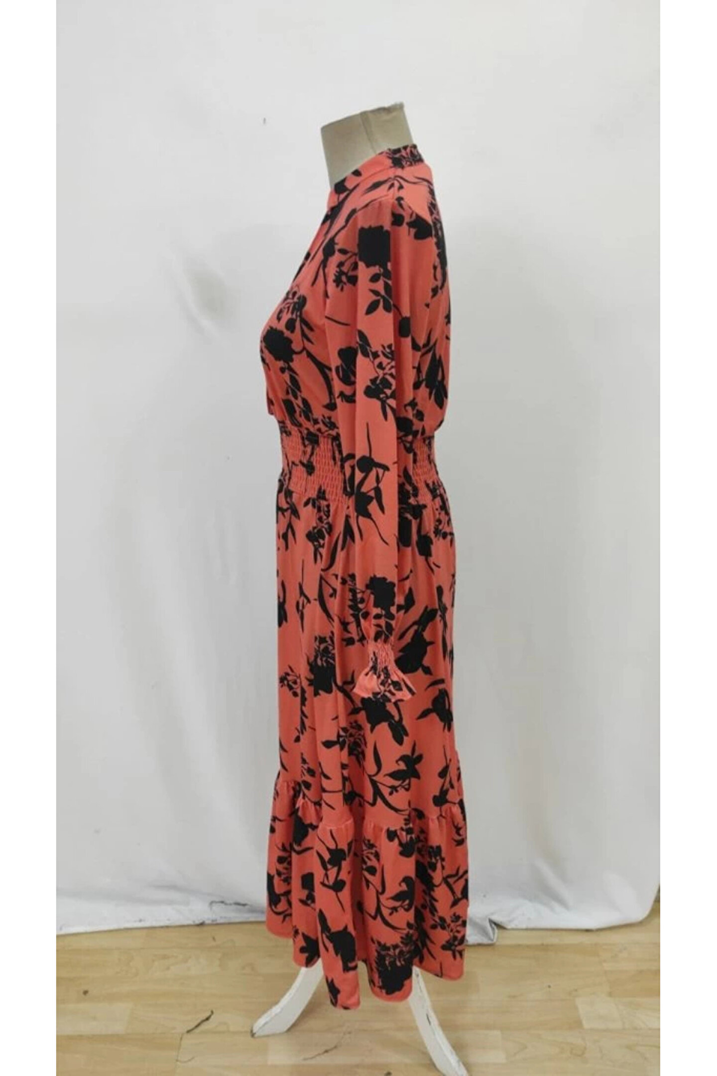 Kadın Uzun Kollu Kruvaze Yakalı çiçek Desenli Maksi Süprem Elbise
