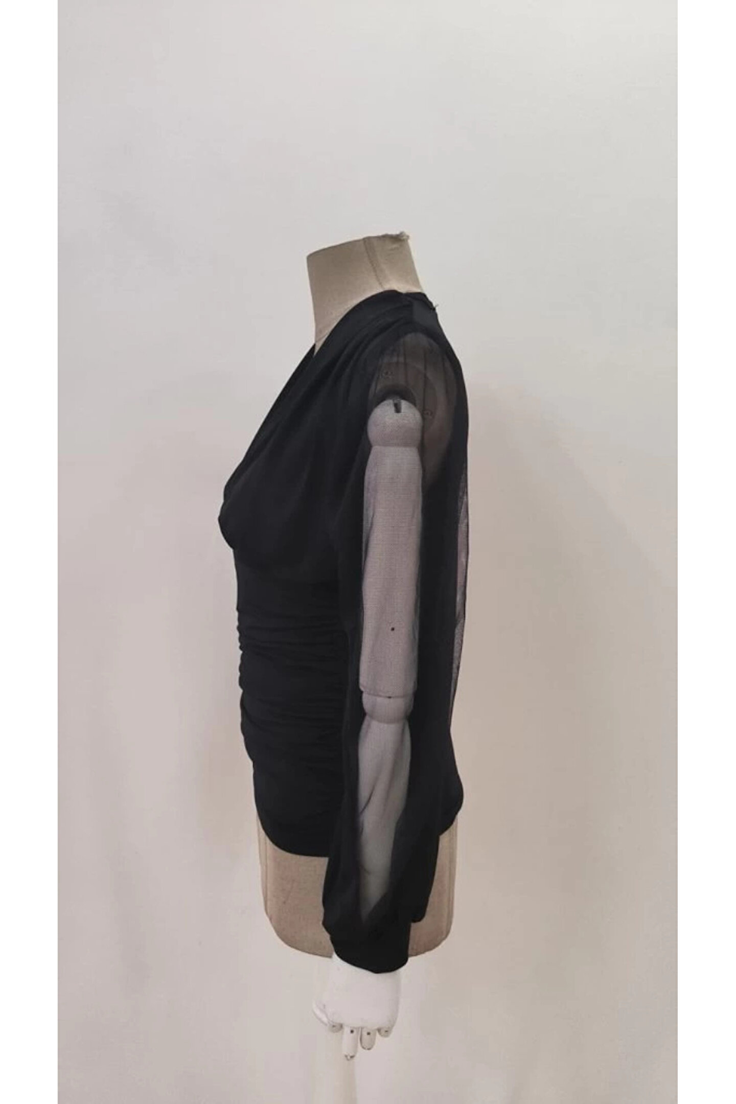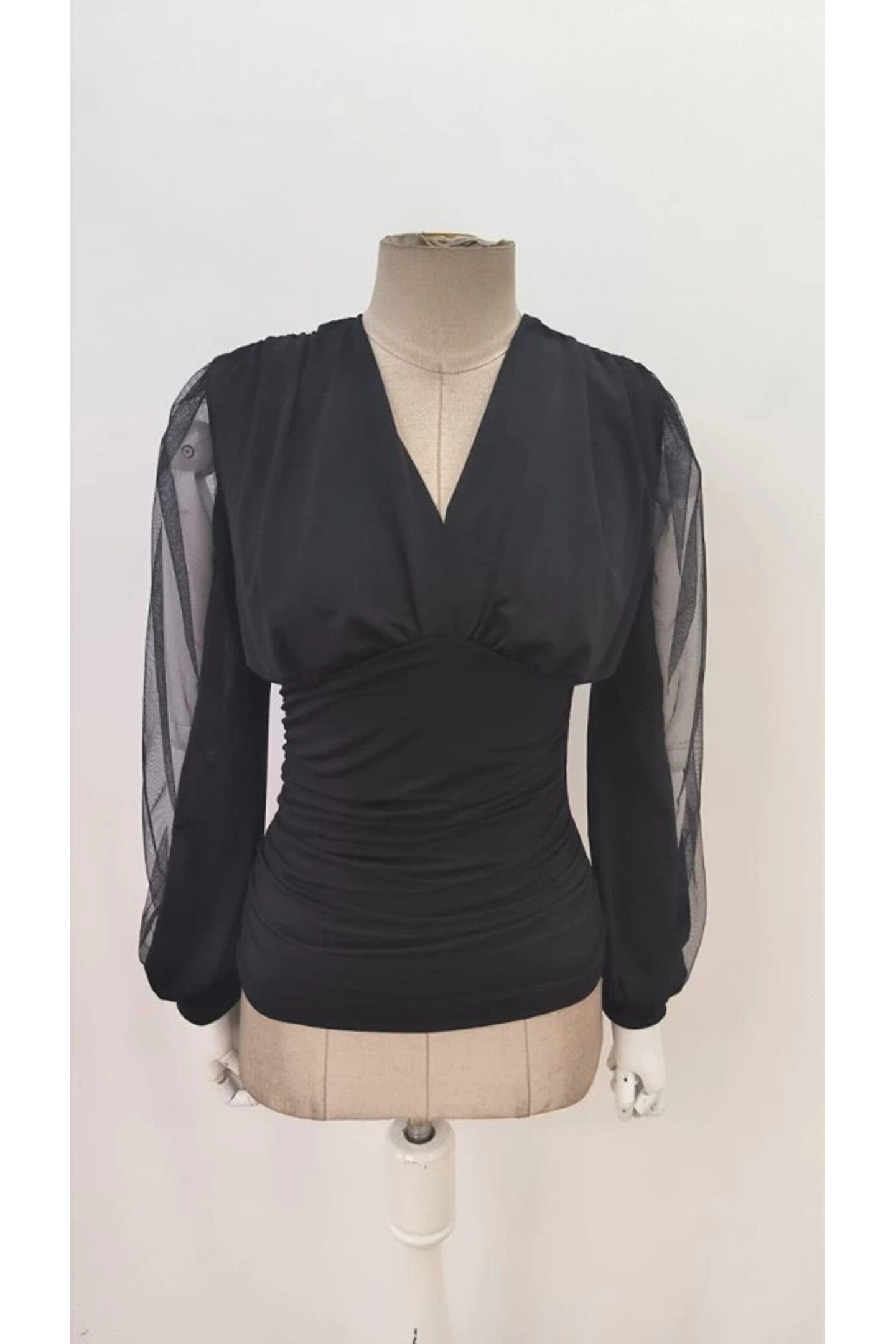 Kadın Uzun Yırtmaç Tül Detaylı Derin V Yakalı Sandy Bluz