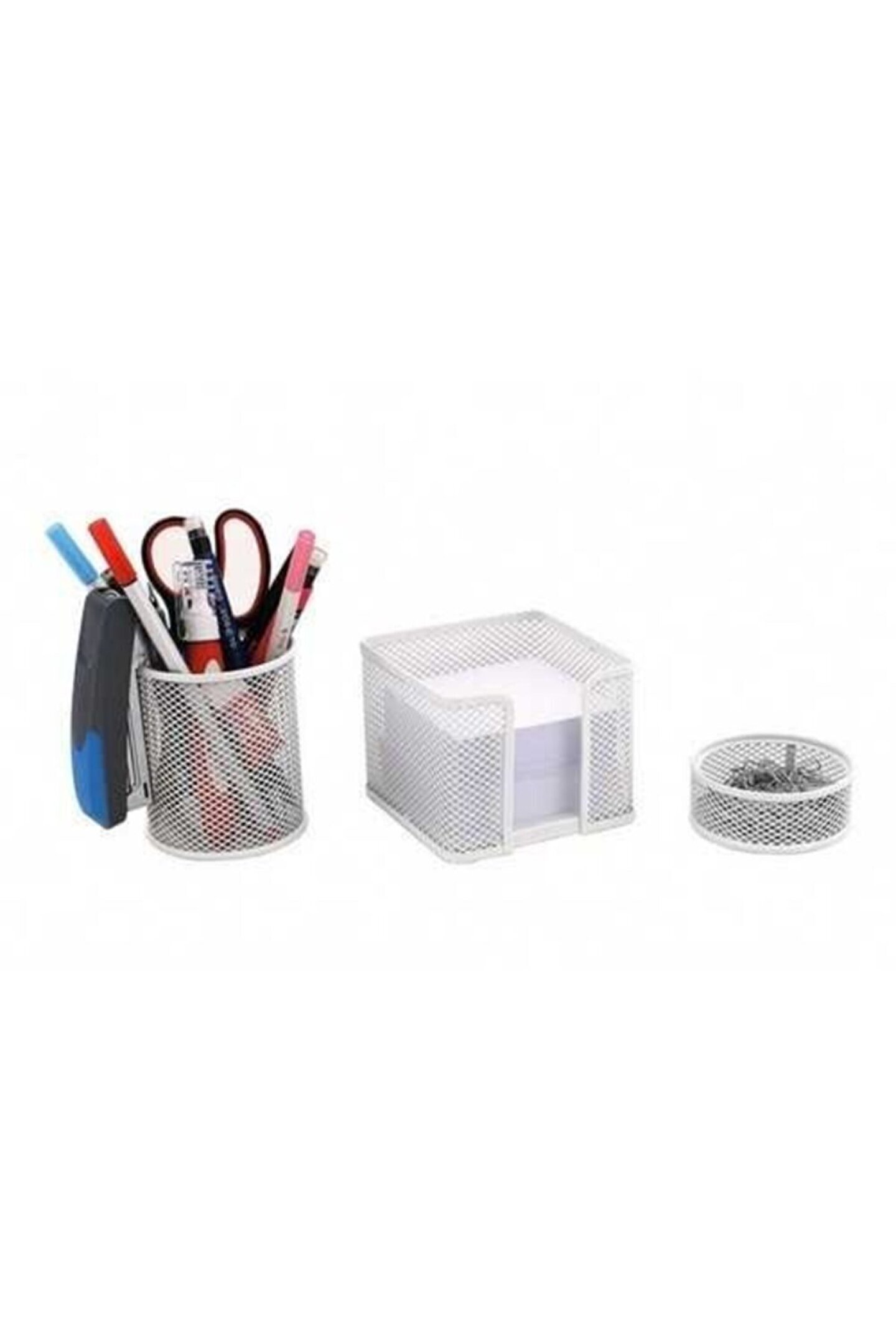 Dayanıklı metal malzeme kullanımı, uzun ömürlü ve sağlam bir kullanım sunar; Perfore tasarımı sayesinde, kalem ve ataş gibi küçük eşyalarınızı kolayca düzenleyebilirsiniz; Beyaz renk seçeneğiyle ofis veya çalışma alanınıza modern ve şık bir dokunuş katar; Üç parçadan oluşan set, farklı ihtiyaçlarınıza uyum sağlayacak şekilde tasarlanmıştır;