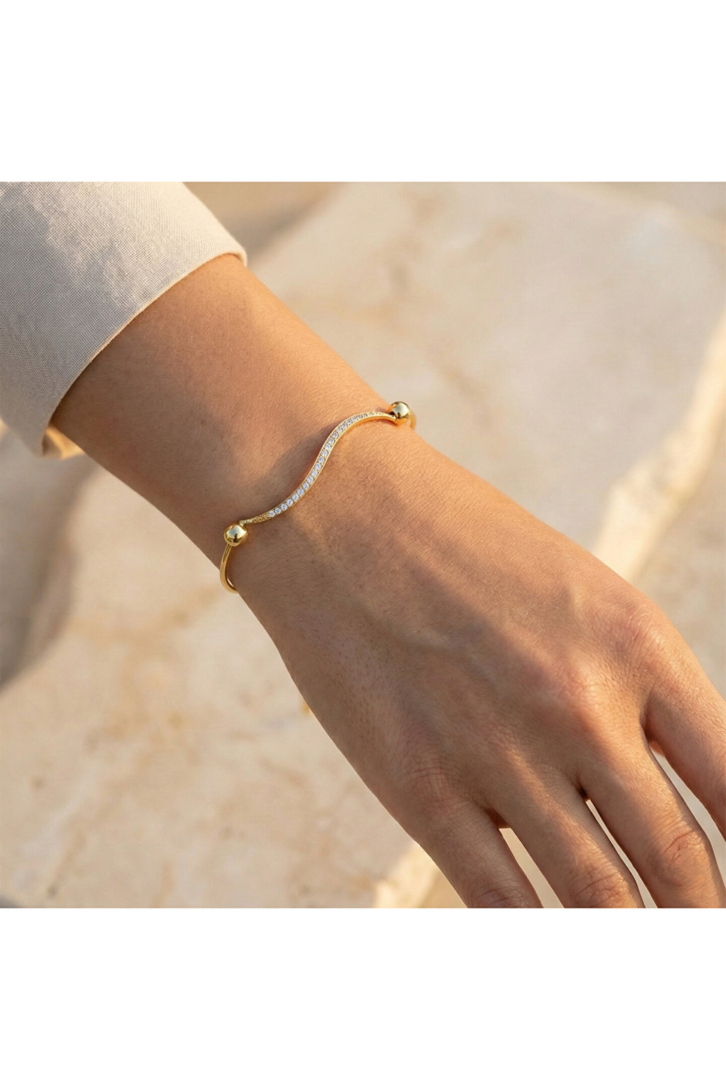 Göz alıcı zirkon taşlarla süslenmiş, şıklığı ve zarafeti bir arada sunan gümüş bileklik; Özel günlerde veya günlük kullanımda tercih edilebilecek, her kıyafetle uyum sağlayacak tasarım; Zirkon taşların ışıltısı ile göz kamaştırıcı bir görünüm elde edilirken, dayanıklılığı ve parlaklığı uzun süre korur; Şarnelli yapısı sayesinde bileğe mükemmel uyum sağlar ve konforlu bir kullanım sunar; Hem gümüş rengi hem de zarif tasarımıyla dikkat çeken bu bileklik, her türden aksesuarla kolayca kombinlenebilir.; Taşlı parçasının genişliği 49.45 mm, yüksekliği 2.80 mm.; toplar 6 mm.