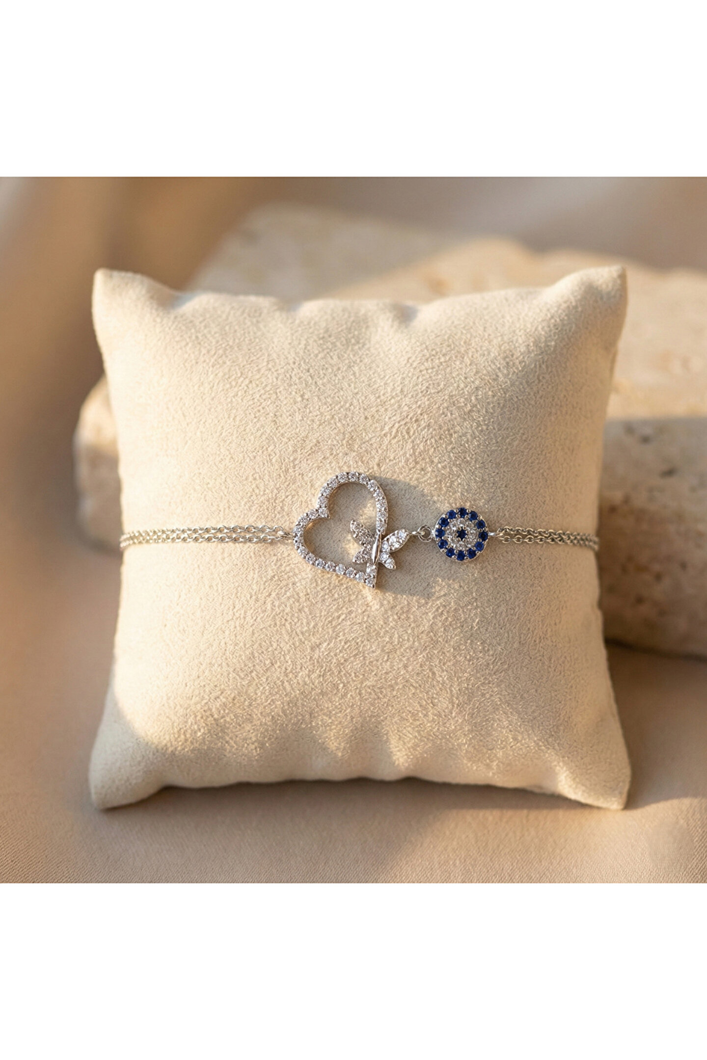 Gümüş zirkon taşlı ve nazar boncuğu detaylı kelebekli kalp bileklik modeli 925 ayar gümüşten ımal edılmıştır.; Gümüş zirkon taşlı ve nazar boncuğu detaylı kelebekli kalp bileklik modeli üzerinde zirkon taşlar kullanılmıştır.; Gümüş zirkon taşlı ve nazar boncuğu detaylı kelebekli kalp bileklik modeli üzerıne rodyum kaplama yapılmıştır.; Rodyum kaplama yapılan gümüş bileklik modellerı parlaklığını uzun süre muhafaza eder ve oksıtlenmesı gecıkır.; Gümüş olan zıncır boyu ayarlanabilir 16-18,5 cm'dır.; Gümüş zirkon taşlı ve nazar boncuğu detaylı kelebekli kalp bileklik modeli %100 el emeğı ıle üretılmıştır.; Gümüş ve değerlı taşlar nedenıyle belırtılen ürün ağırlığında ± %5 sapma olabılmektedır.; Ürün hedıye kutusunda gönderılecektır.; Saat 15:00'a kadar verilen siparişler aynı gün içinde kargoya verilecektir Zirkon taşının Özellikleri; Mücevheratta kullanılan ve çok tercih edilen taş çeşitlerinden biridir.; Zirkon taşı kahverengidir ve ısıtılarak renksiz hale getirilir.; Zirkon taş kahverengi, kırmızı ve sarı renginde kendini gösterir.; Mücevher olarak kullanılan renklerden en çok renksiz olanı tercih edilir.; Zirkon taşının albenisi sadece fiziksel görünümden değil, vücudu rahatlatan zihni kuvvetlendiren duygusal anlamda dengeyi koruyan ve uyumayı kolaylaştırıcı özelliklerinden dolayı da tercih edildiği bilinir.; Ayar925 ayar Net ağırlık 2.25 gram Anti alerji ve kararma önleyici kaplamarhodıum kaplama Zincir boyutuen uzun 18,5 cm en kısa 16 cm ayarlanabilir, Renk beyaz Kelebekli kalp modelinin eni 20.10 mm`dir, boyu 16.30 mm`dir, nazar çapı 6.80 mm`dir.