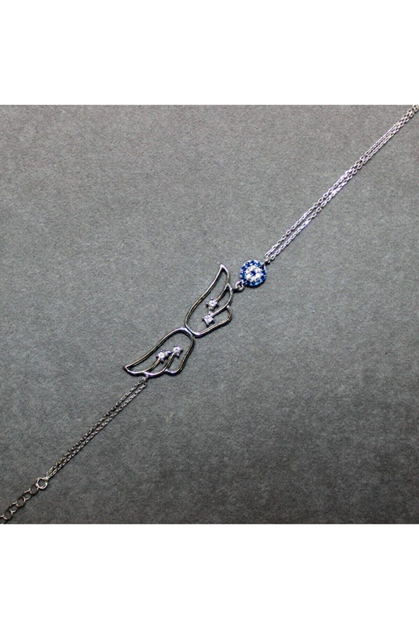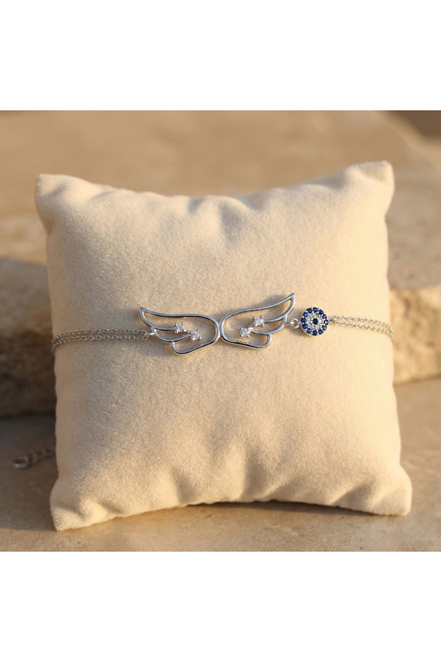 Zarif tasarımıyla dikkat çeken beyaz taşlı melek kanadı bileklik, gümüş rengi ve zirkon taş detaylarıyla göz alıcı bir görünüm sunar; Zirkon taş kullanımı sayesinde, bileklik hem şıklığı hem de parıltıyı bir arada barındırır ve her türlü özel gününüzde ışıltınızı ön plana çıkarır; Melek kanadı motifinin zarif çizgileri, bileklikte modern ve estetik bir dokunuş sağlar, günlük kullanım için idealdir; Gümüş rengi ile klasik ve zamansız bir tarz yaratırken, her türlü kıyafetle kolayca uyum sağlar.; Melek kanadı uzunluğu 11.35 mm, genişliği 38.10 mm, nazarın çapı 6.80 mm.