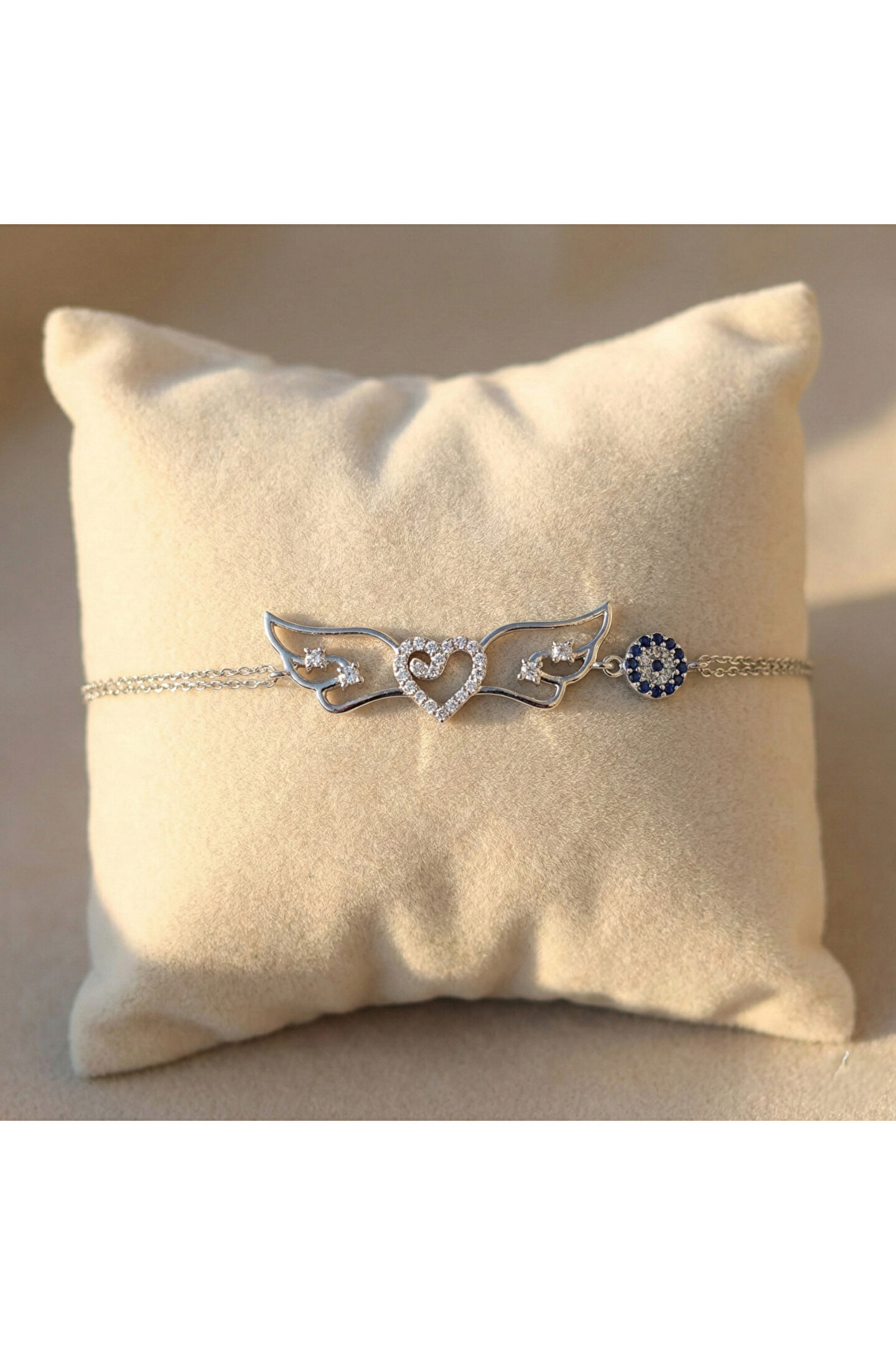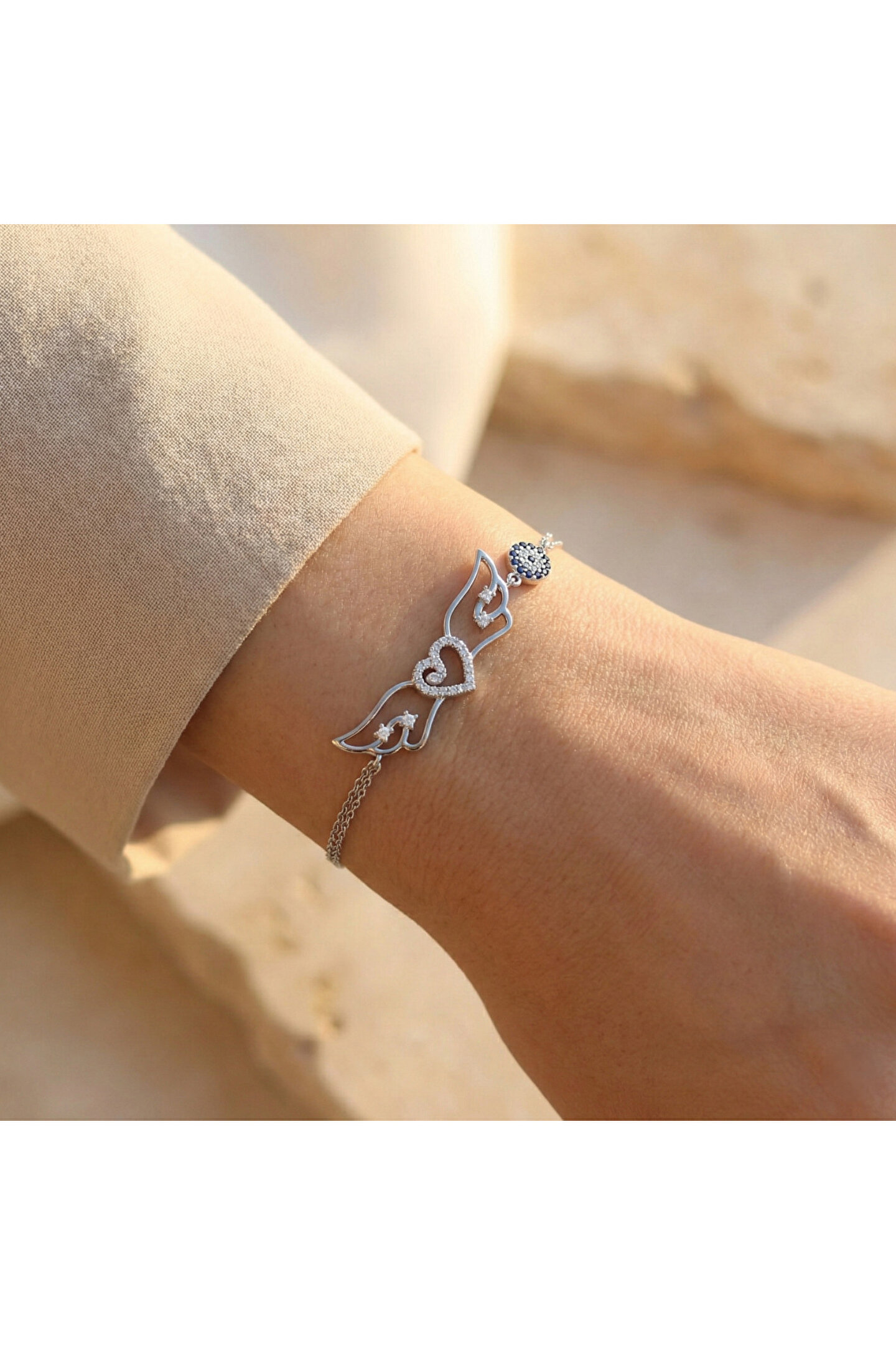 Gümüş zirkon taşlı ve nazar boncuğu detaylı kalpli melek kanadı bileklik modeli 925 ayar gümüşten ımal edılmıştır.; Gümüş zirkon taşlı ve nazar boncuğu detaylı kalpli melek kanadı bileklik modeli üzerinde zirkon taşlar kullanılmıştır.; Gümüş zirkon taşlı ve nazar boncuğu detaylı kalpli melek kanadı bileklik modeli üzerıne rodyum kaplama yapılmıştır.; Rodyum kaplama yapılan gümüş bileklik modellerı parlaklığını uzun süre muhafaza eder ve oksıtlenmesı gecıkır.; Gümüş olan zıncır boyu ayarlanabilir 16-19 cm'dır.; Gümüş zirkon taşlı ve nazar boncuğu detaylı kalpli melek kanadı bileklik modeli %100 el emeğı ıle üretılmıştır.; Gümüş ve değerlı taşlar nedenıyle belırtılen ürün ağırlığında ± %5 sapma olabılmektedır.; Ürün hedıye kutusunda gönderılecektır.; Zirkon taşının Özellikleri; Mücevheratta kullanılan ve çok tercih edilen taş çeşitlerinden biridir.; Zirkon taşı kahverengidir ve ısıtılarak renksiz hale getirilir.; Zirkon taş kahverengi, kırmızı ve sarı renginde kendini gösterir.; Mücevher olarak kullanılan renklerden en çok renksiz olanı tercih edilir.; Zirkon taşının albenisi sadece fiziksel görünümden değil, vücudu rahatlatan zihni kuvvetlendiren duygusal anlamda dengeyi koruyan ve uyumayı kolaylaştırıcı özelliklerinden dolayı da tercih edildiği bilinir.; Ayar925 ayar Net ağırlık 2.94 Anti alerji ve kararma önleyici kaplamarhodıum kaplama Zincir boyutuen uzun 19cm en kısa 16 cm ayarlanabilir, Renk beyaz.; Orta parçada melek kanadının genişliği 37.50 mm, nazar parçasının boyu 6.80 mm`dir.