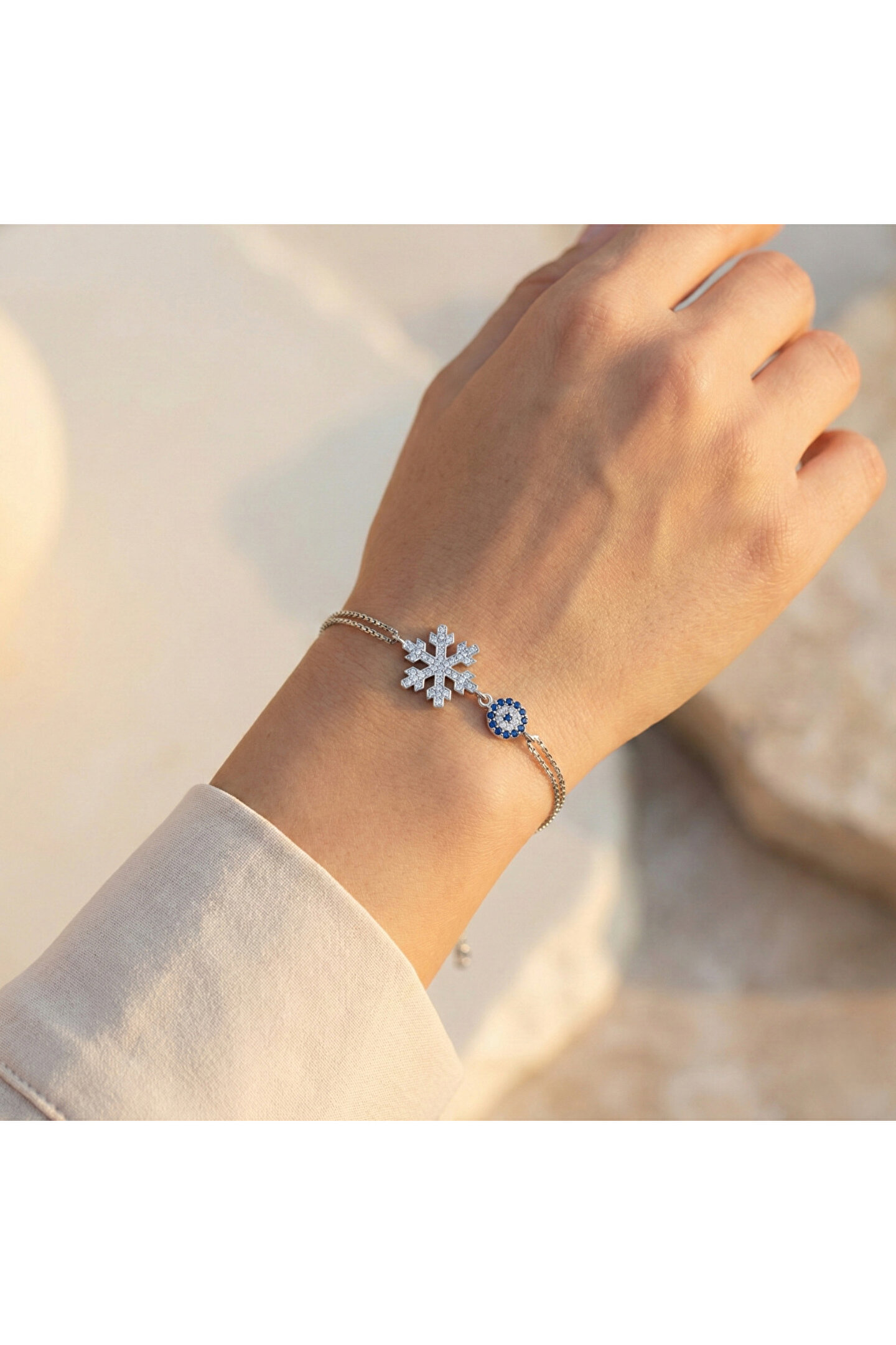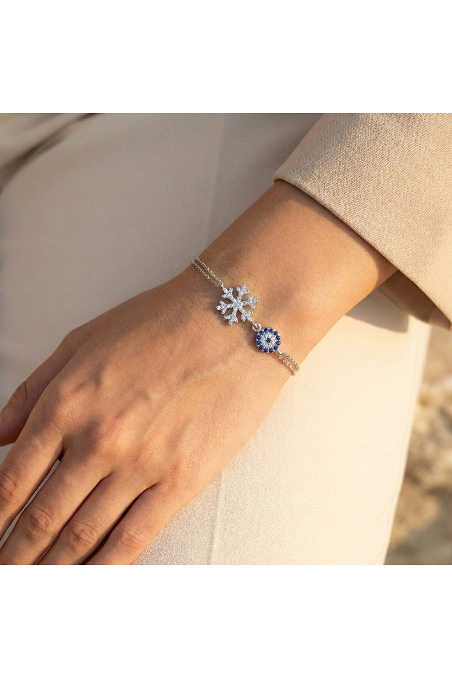 Zarif tasarımıyla dikkat çeken bu bileklik, gümüş rengin asaletini yansıtır; Zirkon taş detayları ile göz alıcı bir parlaklık sunar ve her türlü kıyafetle uyum sağlar; Özel günlerde veya günlük kullanım için ideal bir aksesuar seçeneği olarak öne çıkar; Kaliteli malzeme kullanımı sayesinde uzun süreli kullanım vaat eder.; Kar tanesi çapı 14.45 mm, nazarın çapı 6.80 mm.