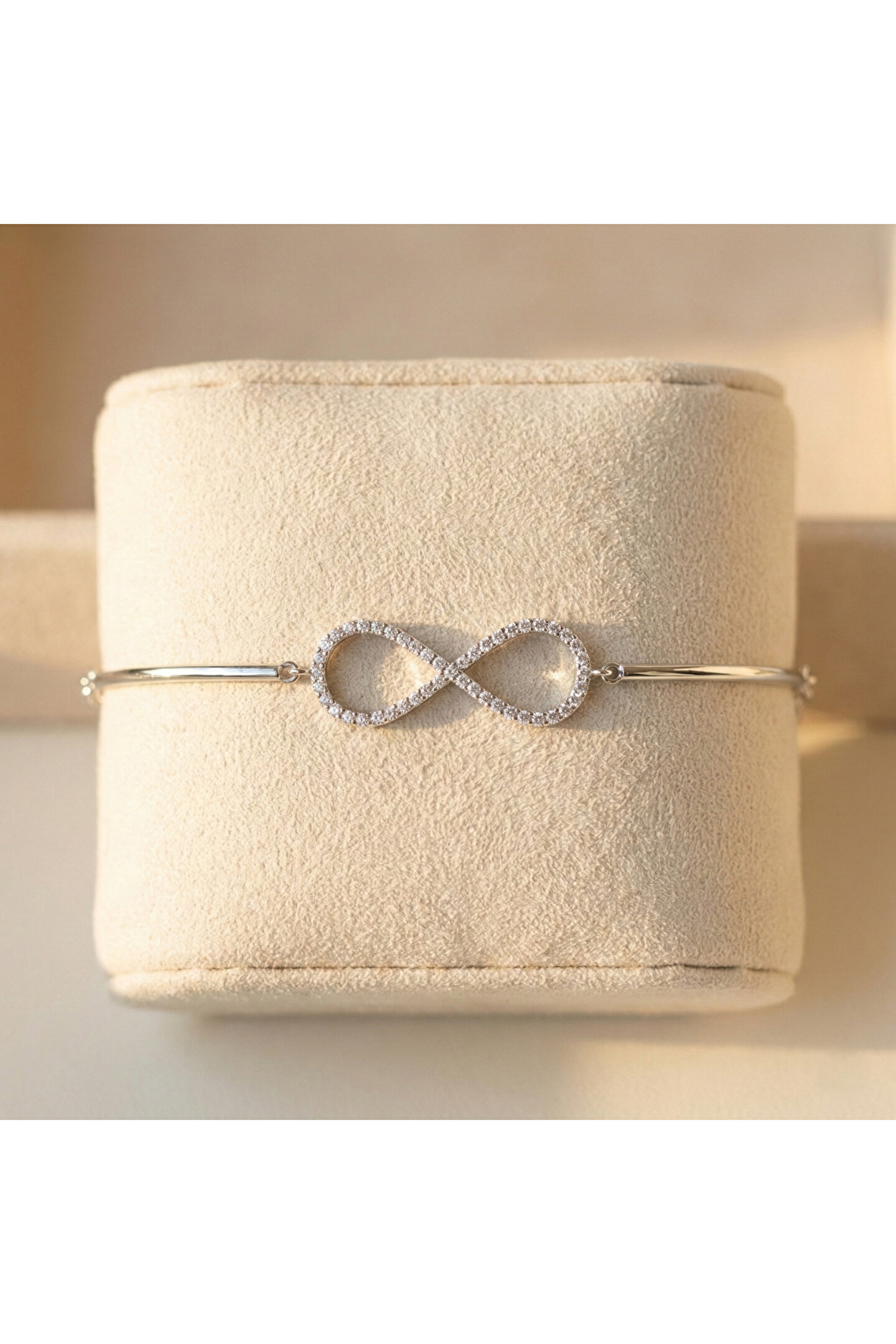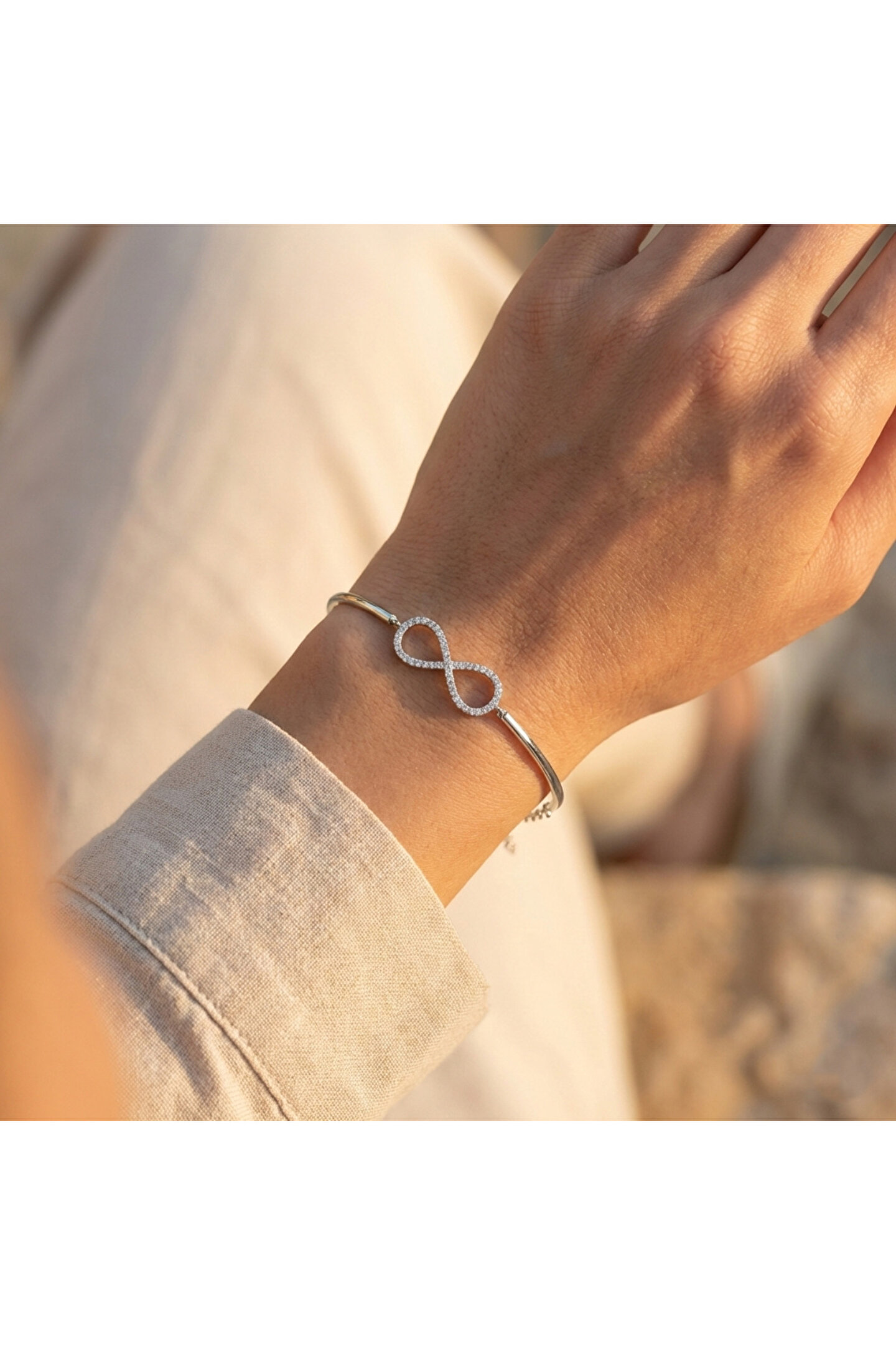 - Zarif tasarımıyla dikkat çeken bu gümüş bileklik, şıklığınızı tamamlayacak bir aksesuar; - Göz alıcı zirkon taş detayları ile ışıltınızı her ortamda ön plana çıkarır; - Sonsuzluk teması, zamansız bir güzellik sunarak her yaş grubuna hitap eder; - Gümüş rengi, klasik ve asil bir görünüm sağlayarak her türlü kıyafetle uyum sağlar.; Sonsuzluk parçasının genişliği 27.70 mm, boyu 10.80 mm, tel 32.20 mm.
