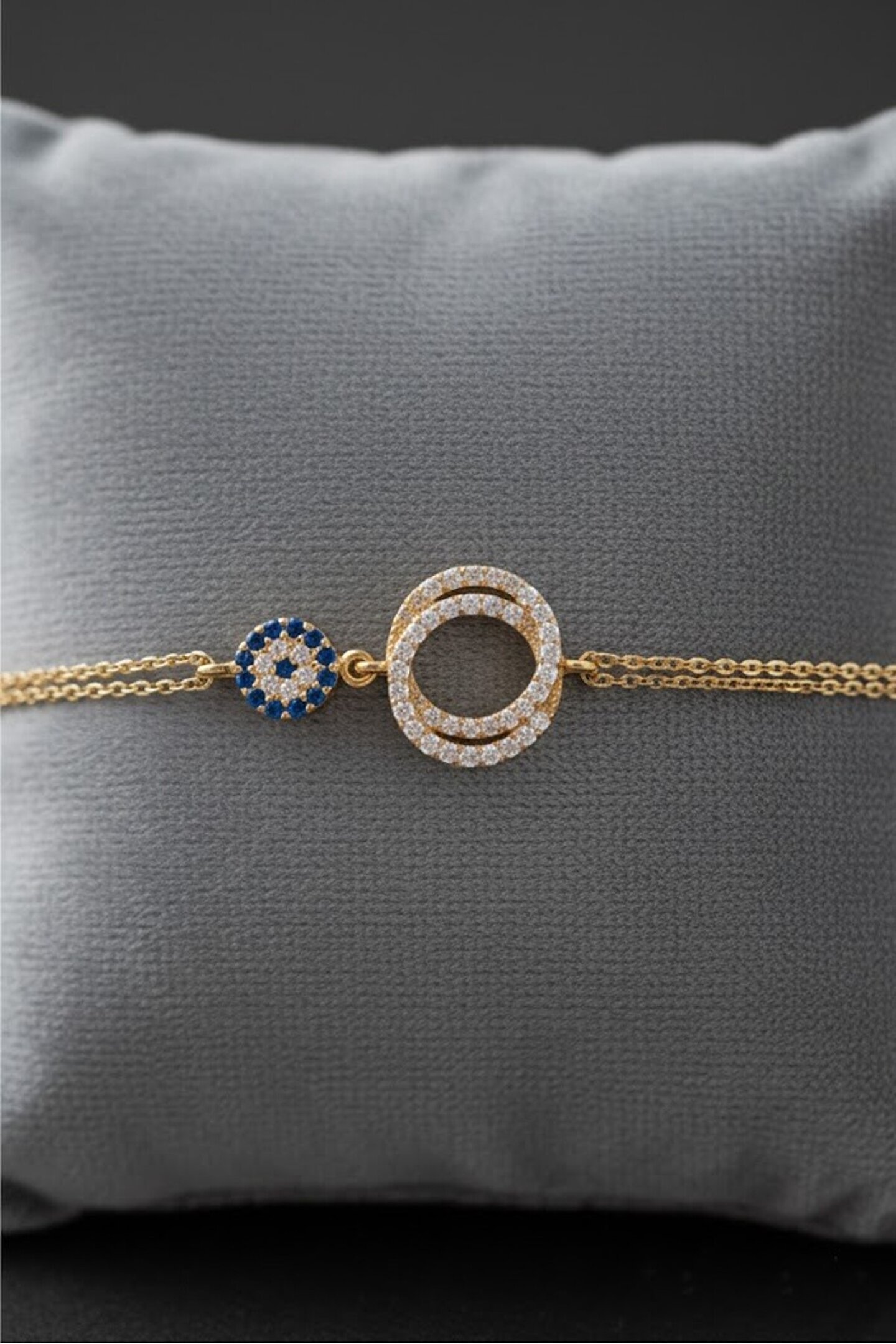 Göğüş kuyumculuk - 1971'den beri Gümüş zirkon taşlı ve nazar boncuğu detaylı çift halka bileklik modeli 925 ayar gümüşten ımal edılmıştır. Gümüş zirkon taşlı ve nazar boncuğu detaylı çift halka bileklik modeli üzerinde zirkon taşlar kullanılmıştır. Gümüş zirkon taşlı ve nazar boncuğu detaylı çift halka bileklik modeli üzerıne rodyum kaplama yapılmıştır. Rodyum kaplama yapılan gümüş bileklik modellerı parlaklığını uzun süre muhafaza eder ve oksıtlenmesı gecıkır. Gümüş olan zıncır boyu ayarlanabilir 16-19 cm'dır. Gümüş zirkon taşlı ve nazar boncuğu detaylı çift halka bileklik modeli el emeğı ıle üretılmıştır. Gümüş ve değerlı taşlar nedenıyle belırtılen ürün ağırlığında ± %5 sapma olabılmektedır. Ürün hedıye kutusunda gönderılecektır. Zirkon taşının özellikleri; Mücevheratta kullanılan ve çok tercih edilen taş çeşitlerinden biridir. Zirkon taşı kahverengidir ve ısıtılarak renksiz hale getirilir. Zirkon taş kahverengi, kırmızı ve sarı renginde kendini gösterir. Mücevher olarak kullanılan renklerden en çok renksiz olanı tercih edilir. Zirkon taşının albenisi sadece fiziksel görünümden değil, vücudu rahatlatan zihni kuvvetlendiren duygusal anlamda dengeyi koruyan ve uyumayı kolaylaştırıcı özelliklerinden dolayı da tercih edildiği bilinir. Ayar925 ayar net ağırlık 2.32 gram anti alerji ve kararma önleyici kaplamarhodıum kaplama zincir boyutuen uzun 18,5 cm en kısa 16 cm ayarlanabilir, renk: gold