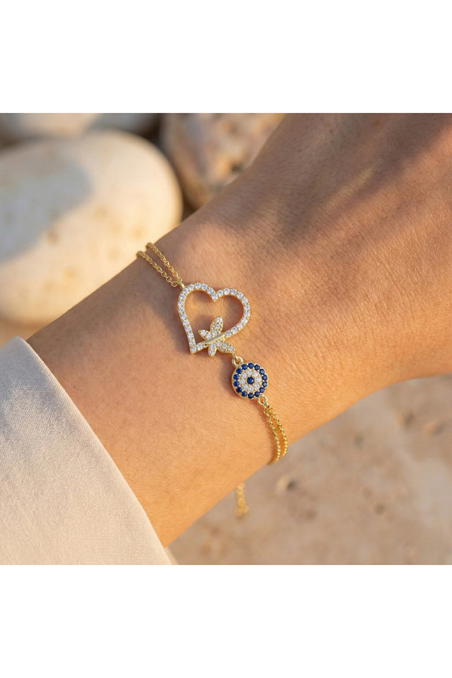 Zarif tasarımıyla dikkat çeken taşlı kelebekli kalp bileklik, gümüş rengi ve zirkon taş detaylarıyla göz alıcı bir görünüm sunar; Zirkon taş kullanımı sayesinde, bileklik hem şıklığı hem de parıltıyı bir arada barındırır ve her türlü özel gününüzde ışıltınızı ön plana çıkarır; Kalp şeklindeki tasarımıyla sevginin ve aşkın sembolü olan bu bileklik, anlamlı anlarınıza eşlik ederken zarafetiyle de stilinizi tamamlar; Gümüş rengi sayesinde farklı renklerle kolayca uyum sağlar ve çeşitli kıyafet kombinlerinizle mükemmel bir uyum yakalar.; Kalp parçasının boyu 16.40 mm, eni 19 mm, nazar parçasının çapı 6.80 mm`dir.
