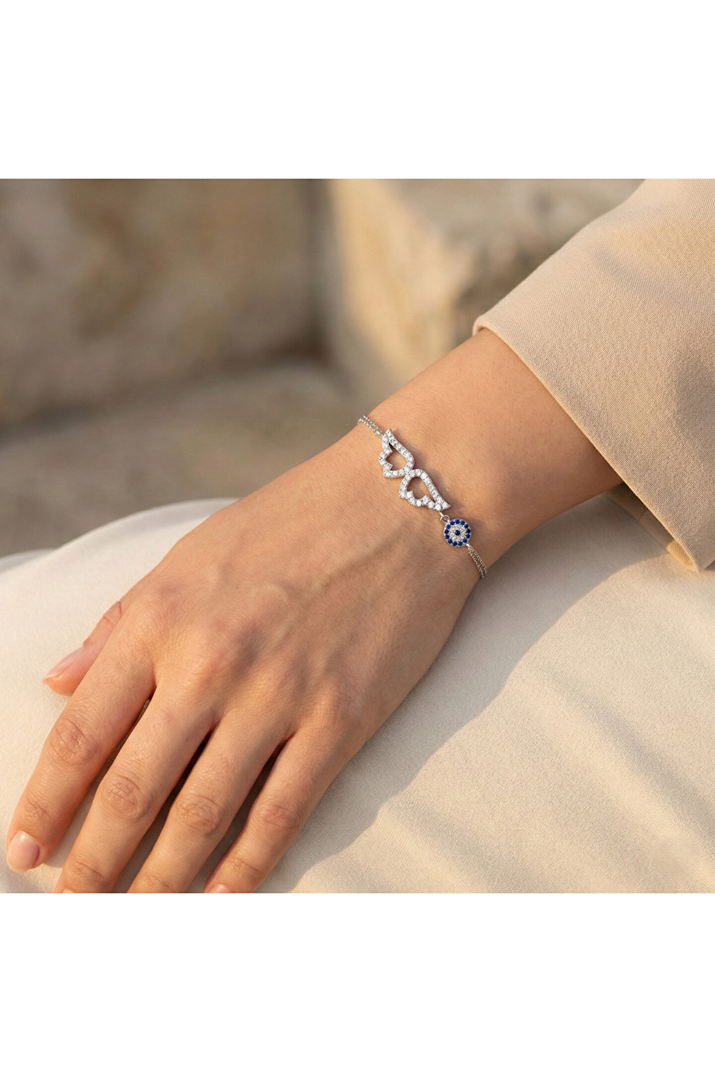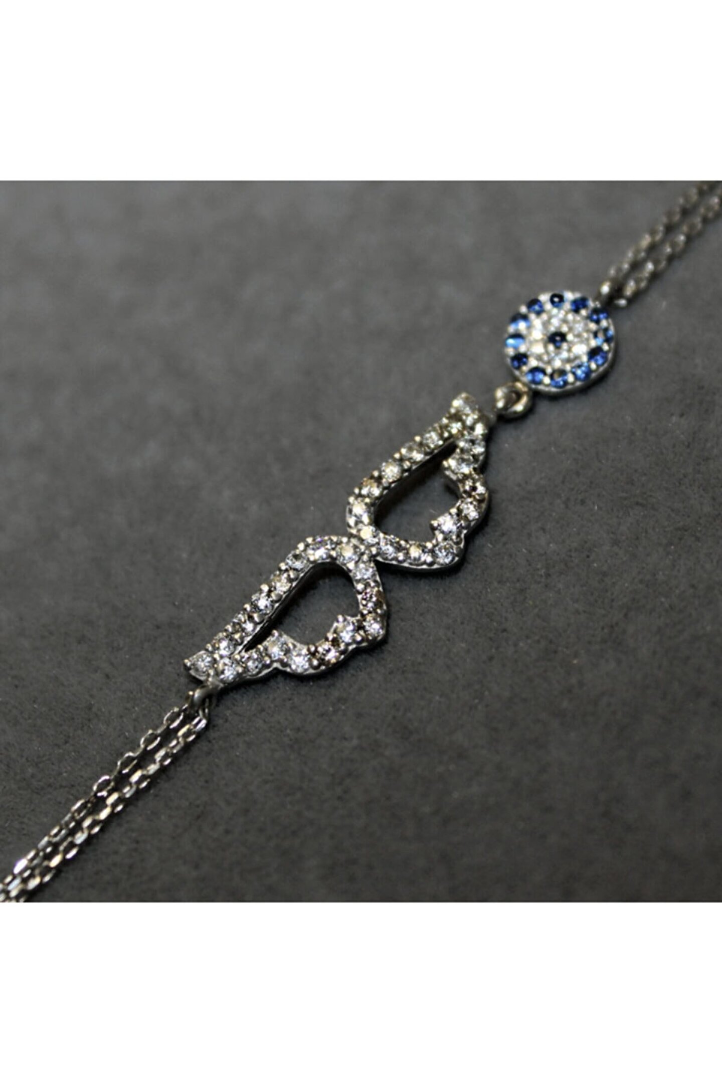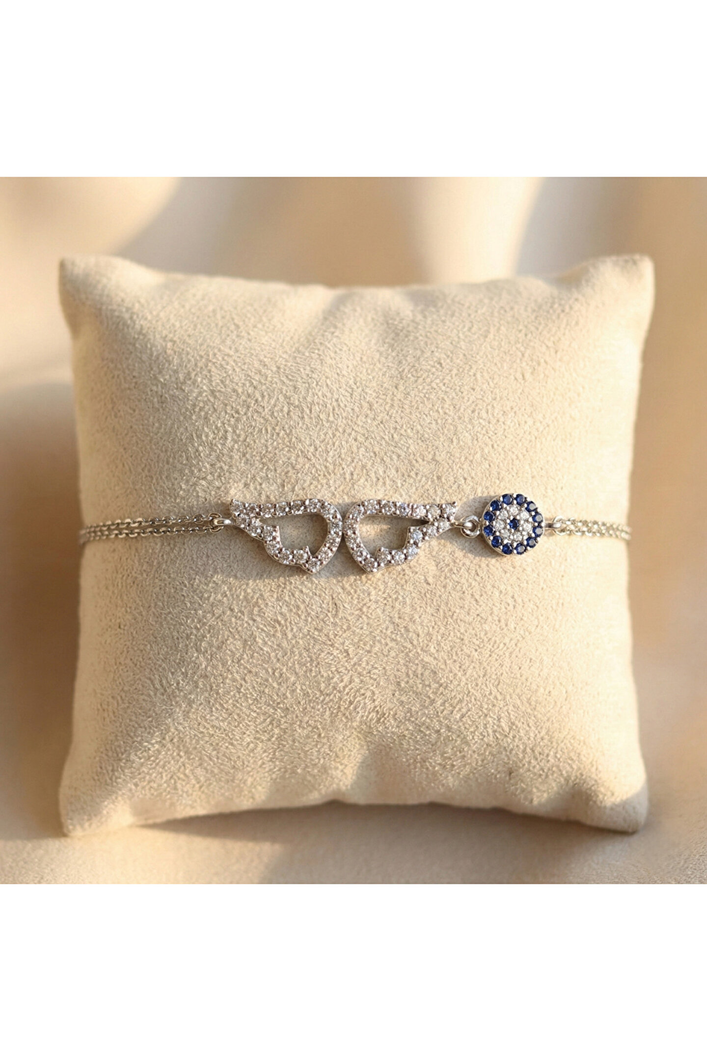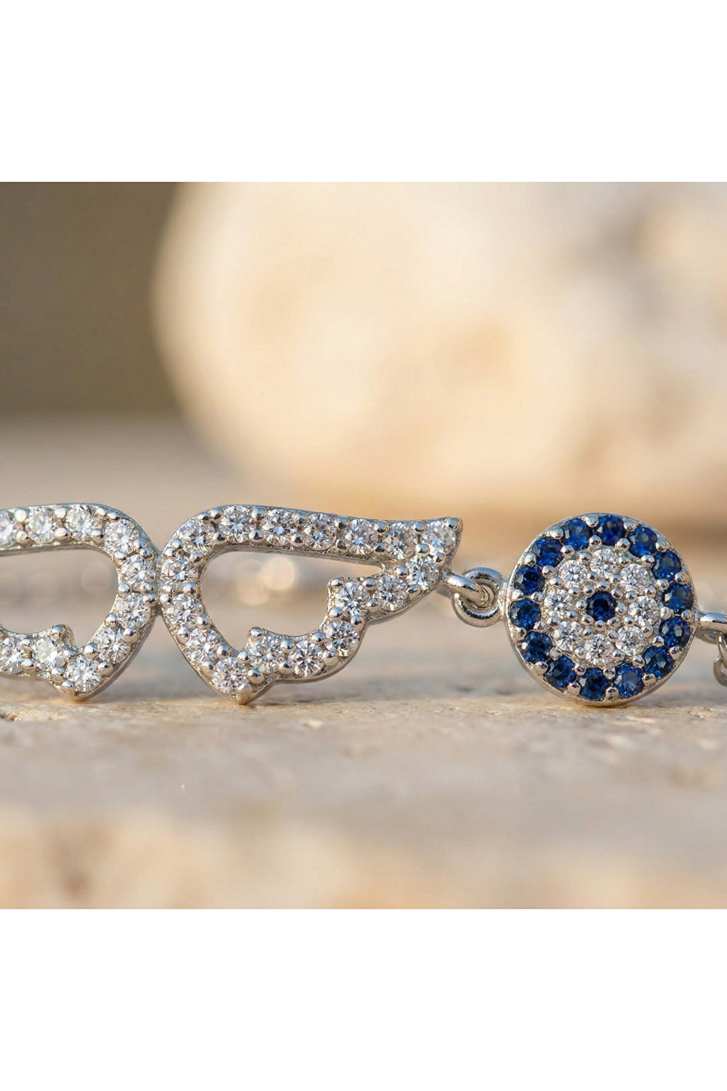 Zarif tasarımıyla dikkat çeken bu bileklik, gümüş rengin asaletini yansıtır; Zirkon taş detayları ile göz alıcı bir parlaklık sunar ve her türlü kıyafetle uyum sağlar; Melek kanadı motifinin zarafeti, bileklikte hayat bulur ve stilinizi tamamlar; Özel günlerinizde veya günlük kullanım için ideal bir aksesuar seçeneği olarak öne çıkar.; Kanat genişliği 25.27 mm, boyu 8.25 mm, nazarın çapı 6.80 mm.