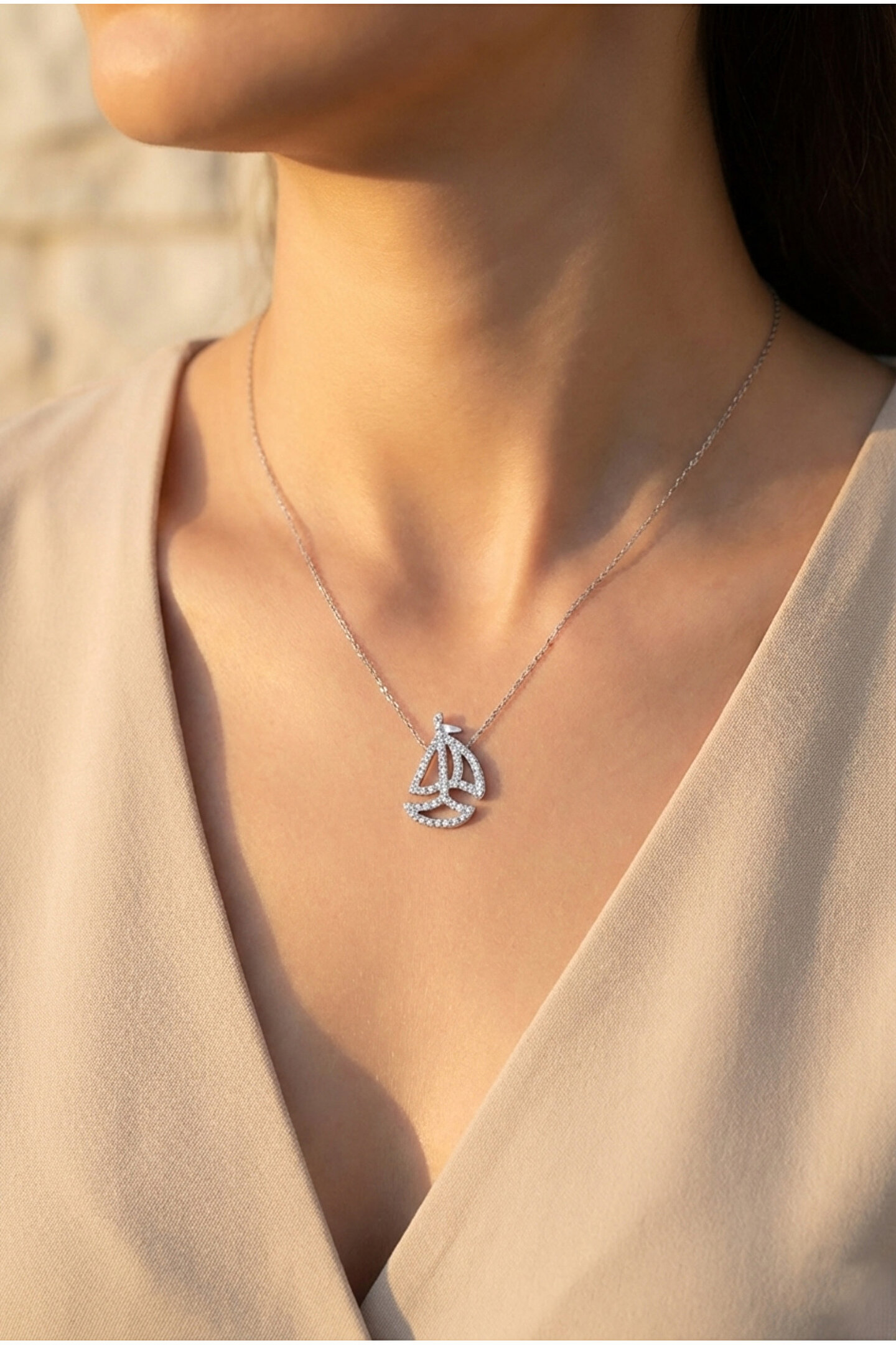 Göz alıcı zirkon taşlarla süslenmiş, zarif tasarımıyla dikkat çeken taşlı yelken kolye; Gümüş rengi kaplama ile modern ve şık bir görünüm sunar; Zirkon taşların ışıltısı, her ortamda göz kamaştırıcı bir etki yaratır; Özel günlerde veya günlük kullanım için ideal, her kıyafetle uyum sağlayacak zarif bir aksesuar;