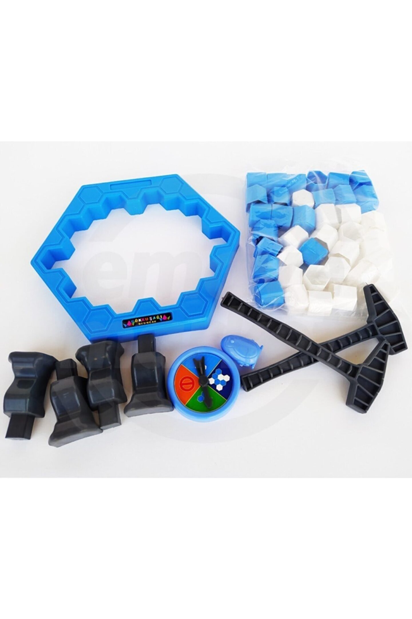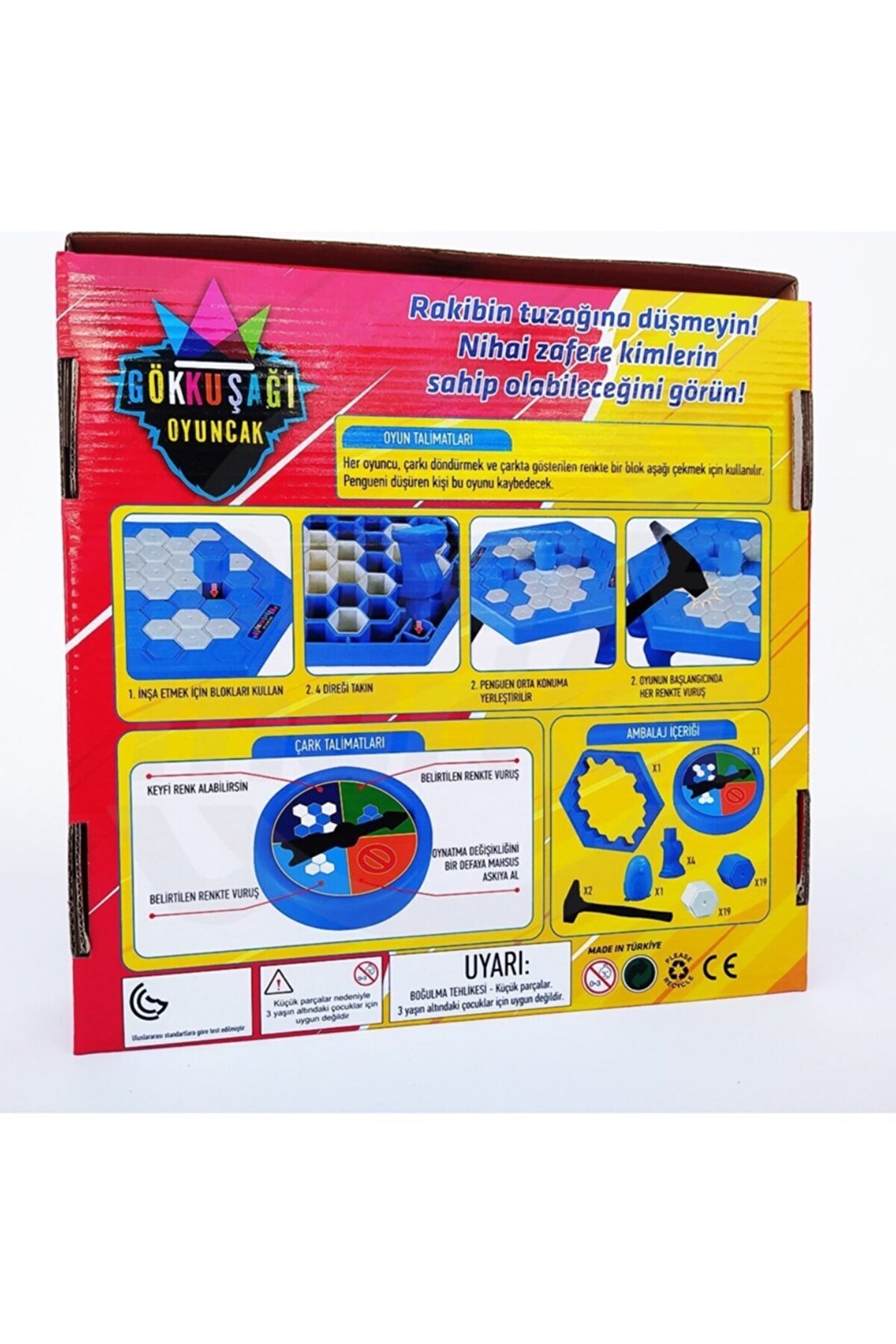 Gökkuşağı buz tuzağı buz kırma zeka strateji oyunu Buz tuzağı buz kırma oyunu (akıl,zeka,straji oyunu El ve göz koordinasyonu artırır. ; Görsel algı kabiliyetini geliştirir. ; 3+ yaş grubu için uygundur. ; Nasıl oynanır ? Oyun 2 kişi ile oynanmaktadır. ; Taraflar sırasıyla oyun pusulasını çevirerek verilen talimatlar doğrutulsunda mavi ya da beyaz renkteki buzlara vurarak oynar. ; Amaç ortadaki pengueni düşürmektir. ; Rakibi zora sokacak doğru hamleyi düşündüren bir strateji geliştirmek gerekmektedir. ; Buzlar azaldıkça penguen tehlikeye girer ve oyun zorlaşır. ; Ailecek oynabilecek bir oyundur. ; Evde aile arasında turnavalar yapılabilecek eğlenceli ve güzel bir oyundur .;