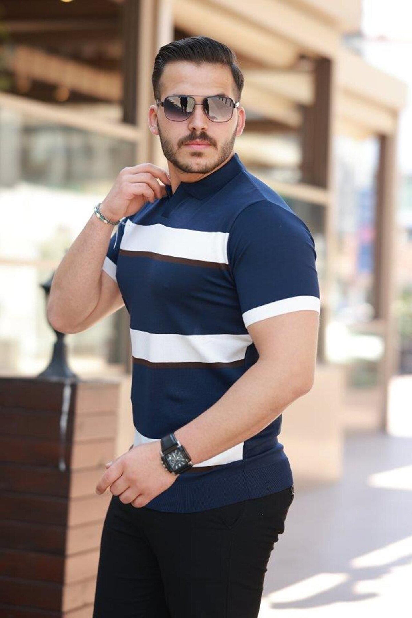Gökyüzü Moda Erkek şerit Desenli Hemşire Yaka Kısa Kollu Tişört