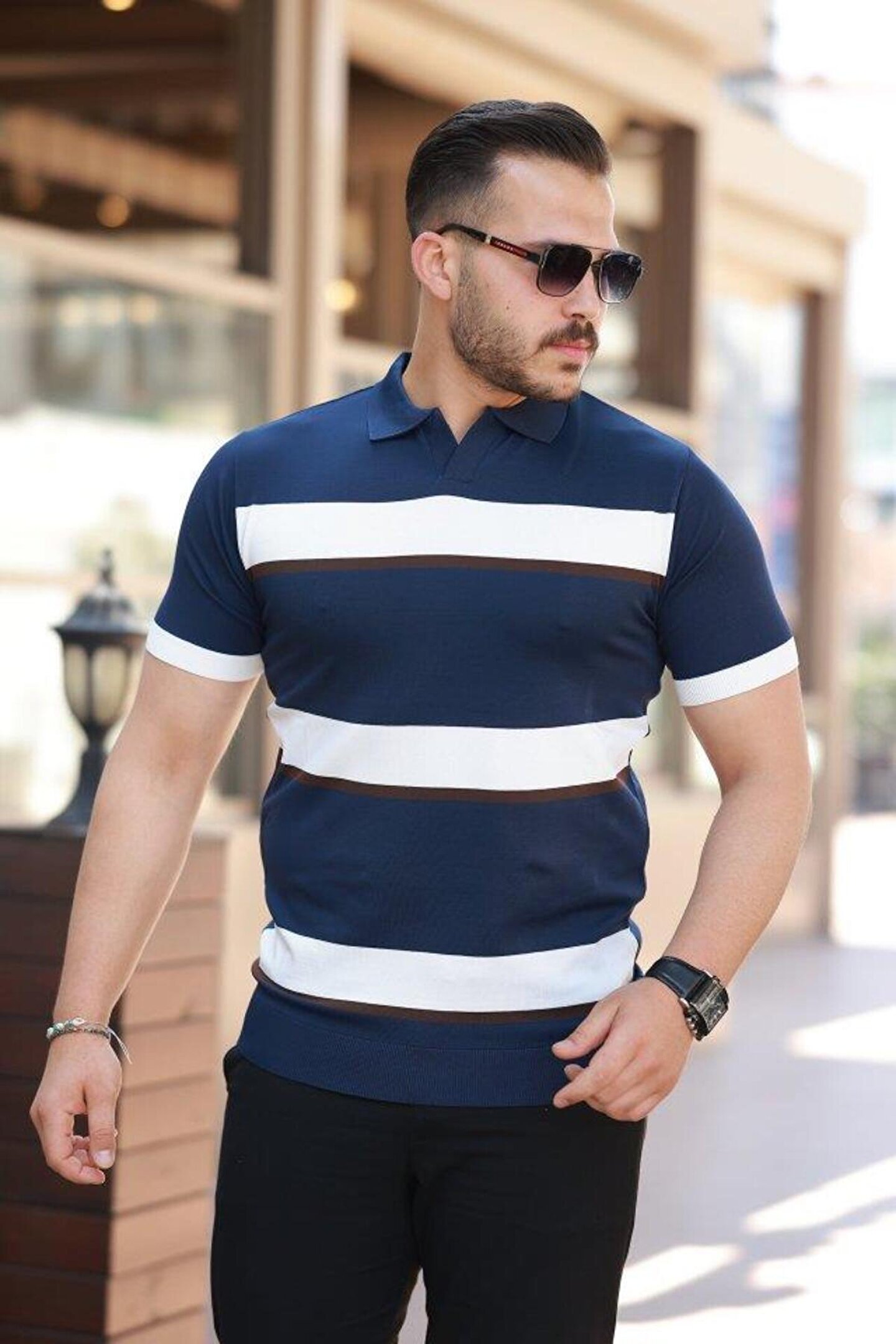 Gökyüzü Moda Erkek şerit Desenli Hemşire Yaka Kısa Kollu Tişört