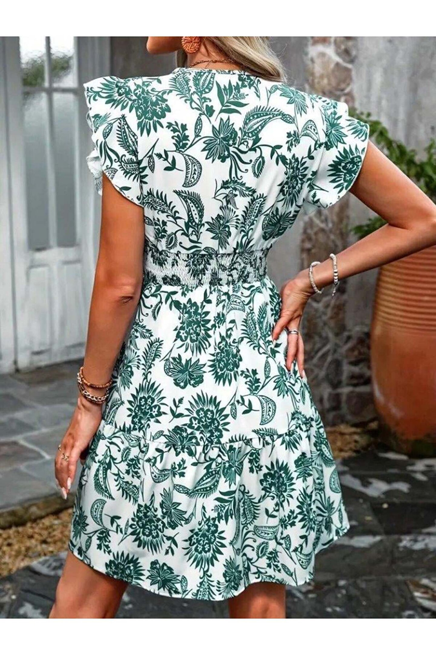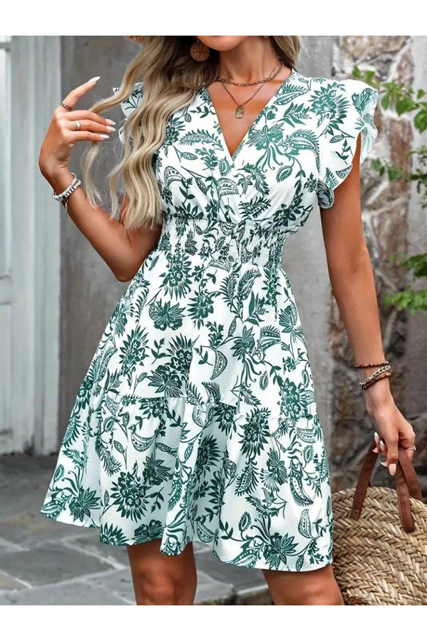 Gökyüzü Moda Kadın Kısa Fırfır Kollu Kruvaze Yaka çiçekli Atlas Elbise