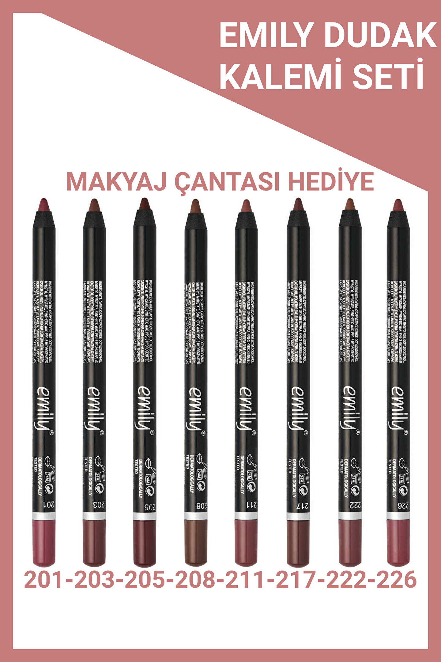 - Emily Dudak Kalemi 8'li Set, her dudak tonuna uygun renk seçenekleri sunar.; - No: 201'den No: 226'ya kadar geniş bir renk skalası ile dudaklarınızda farklı tonları keşfedin.; - Özel makyaj çantasıyla birlikte gelen bu set, günlük kullanım için idealdir.; - Erkul Kozmetik tarafından üretilmiş olup, Türkiye'de güvenle kullanabilirsiniz.; - Çok renkli tasarımıyla her makyaj stiline kolayca uyum sağlar.; - Kullanım talimatlarına uyarak uzun süreli kullanımın keyfini çıkarın.