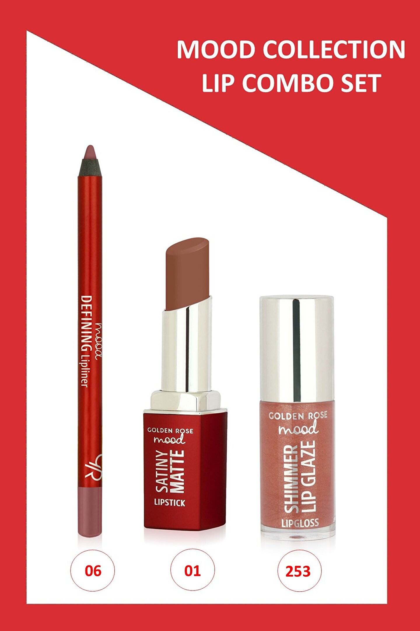 Mood Lip Combo Set - Dudak Kalemi No:06 - Matte Ruj No:01- Dudak Parlatıcısı No: 253