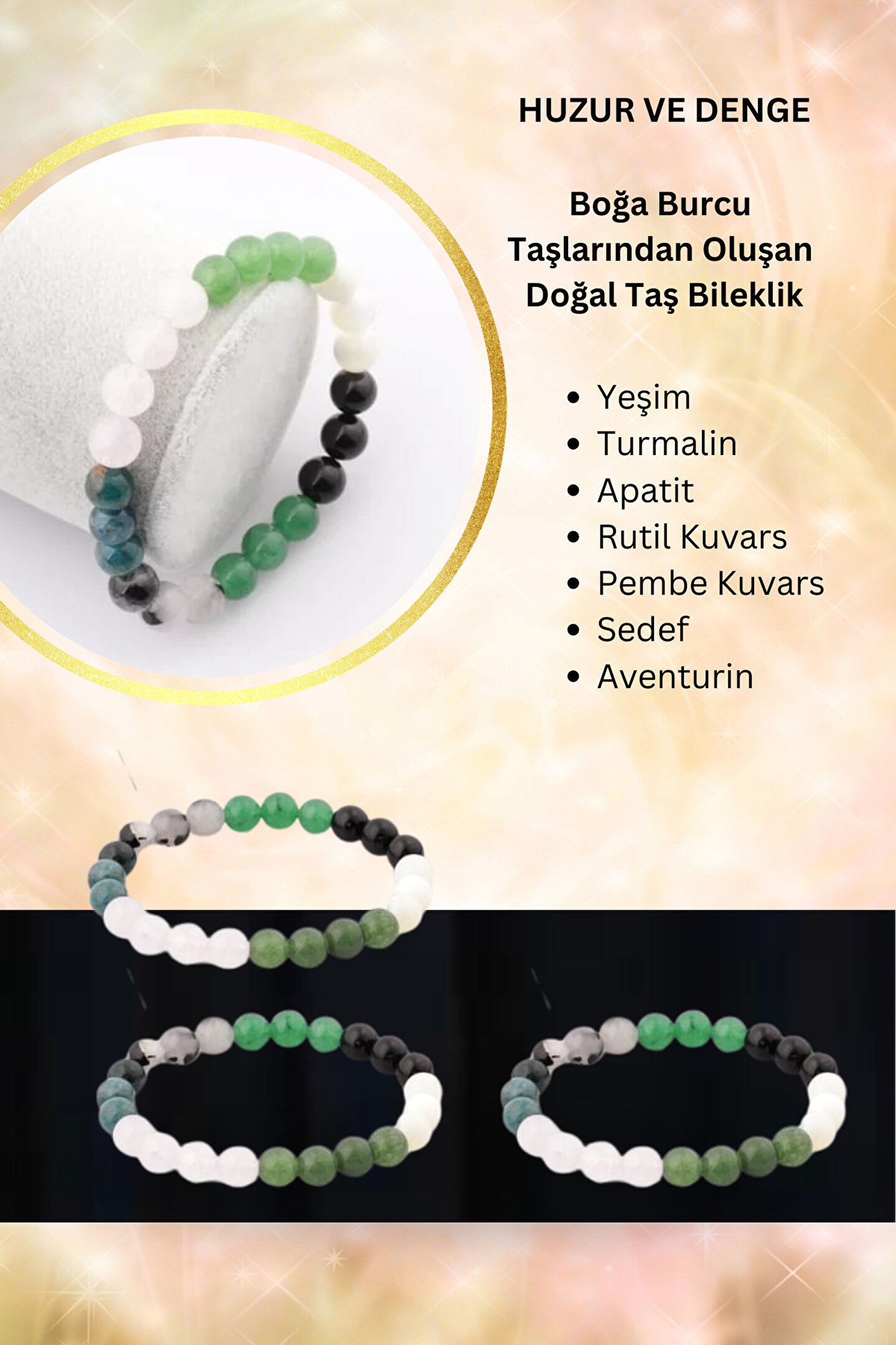 Boğa burcu taşlarından oluşan bu bileklik, hem şıklığı hem de enerjiyi bir arada sunar; Doğal taş kullanımı sayesinde her bileklik benzersiz ve otantik bir görünüm kazanır; Huzur ve dengeyi simgeleyen bu aksesuar, günlük kullanım için idealdir; Doğal taş materyali ile cildinizle dost, alerji yapmayan bir yapıya sahiptir;