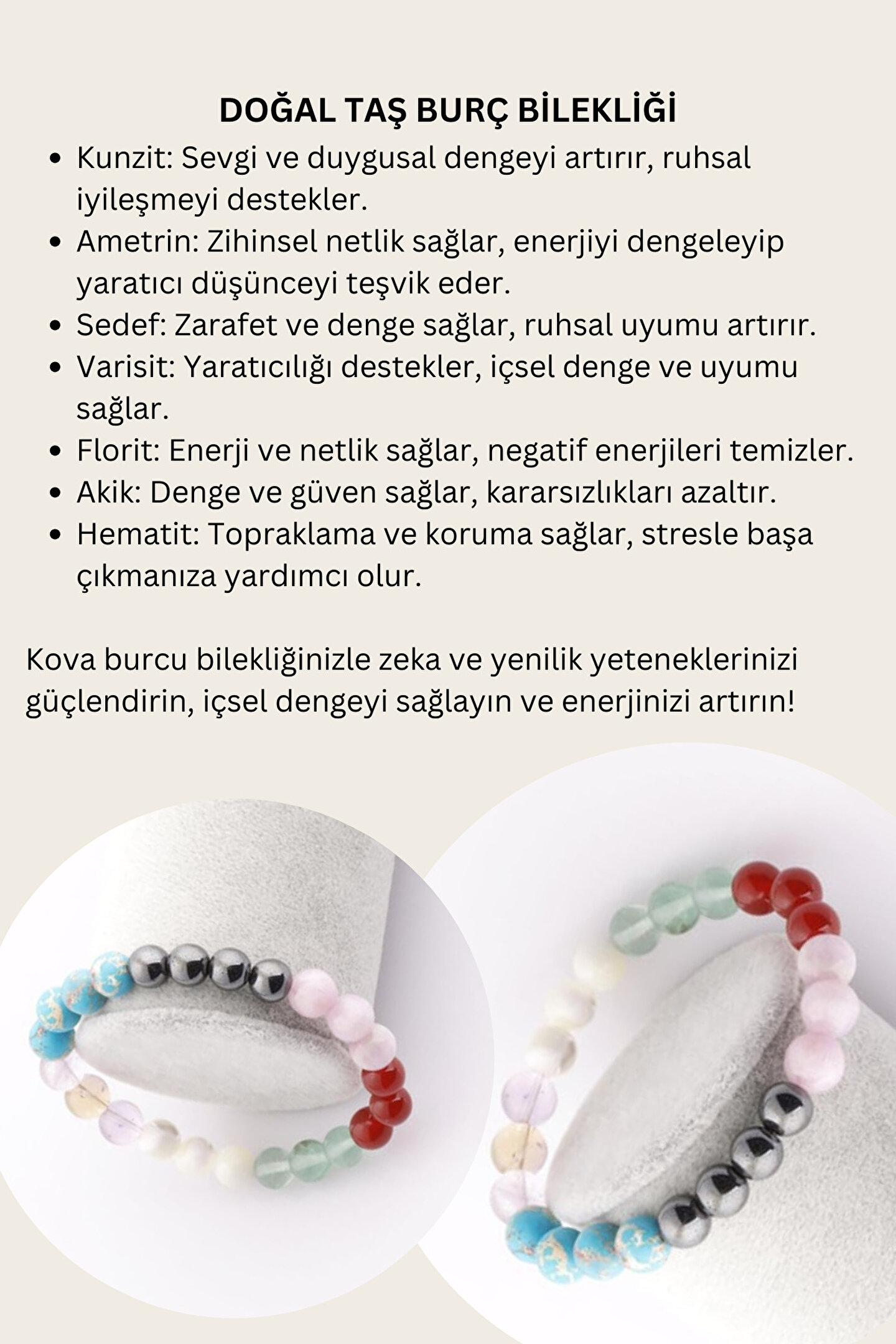 Kova burcu taşlarından oluşan bu bileklik, burcunuzun enerjisini ve pozitif etkilerini günlük yaşamınıza taşır; Her bir bileklik, Kova burcunuzun temel özelliklerini ve enerjisini yansıtan özel taşlarla hazırlanmıştır; Doğal taş kullanımı sayesinde hem şık bir aksesuar hem de burcunuzun pozitif etkilerini hissetmenize yardımcı olacak zarif bir tasarıma sahiptir;