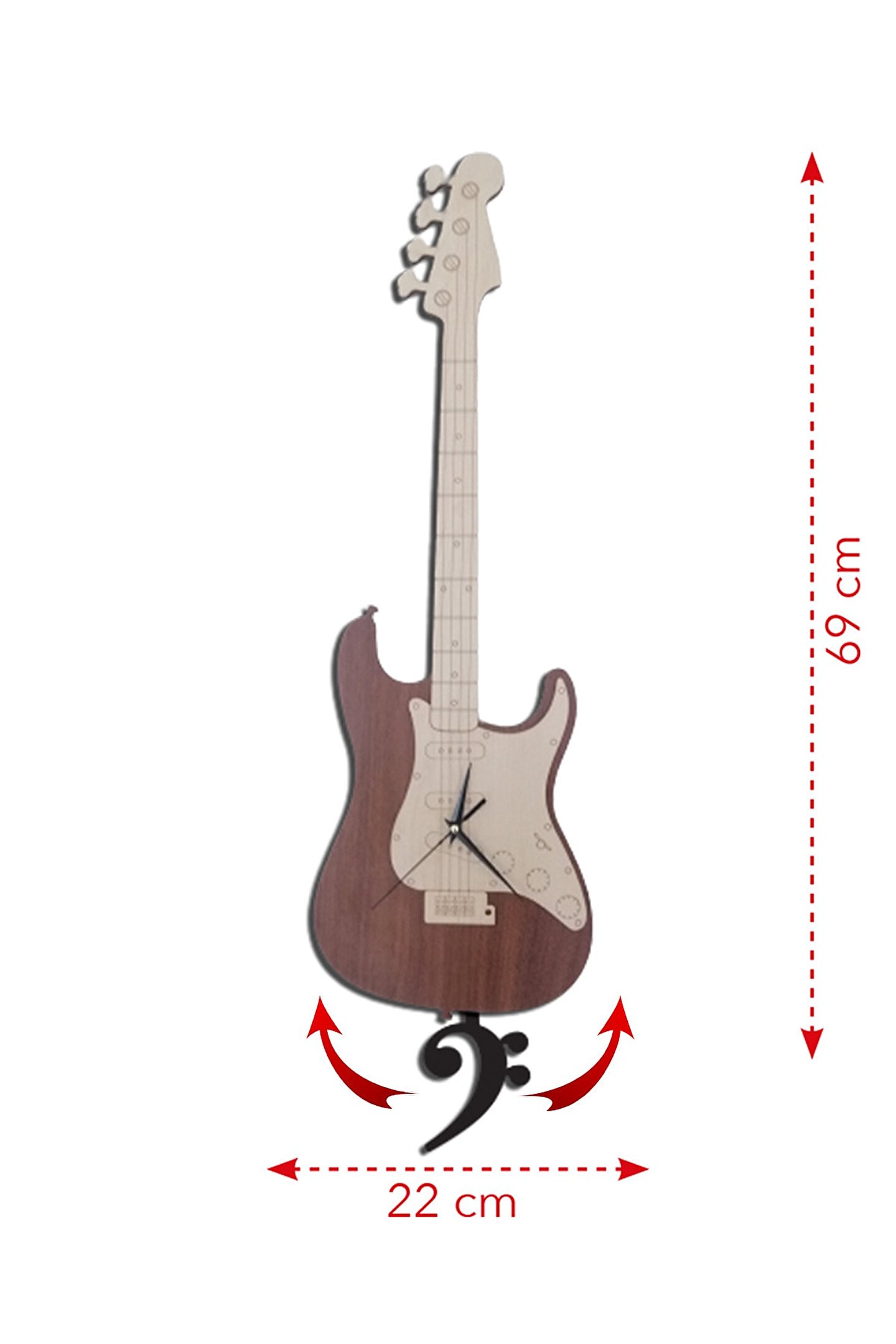 Goodtime Bas Gitar Dekoratif Sarkaçlı Duvar Saati ; Ürün özellikleri: ; - 1. Kalite Ahşap Mdf Malzemeden üretilmiştir. ; - Ürün tamamen el yapımıdır. (hand made) ; - 2 adet AA pil ile çalışır. ; - 1 adet pil, saati çalıştırır; diğer pil sarkacı hareket ettirir. ; - Her saniyede “Fa Anahtarı” sağa sola hareket eder. ; - Mekanizması yüksek kaliteli sessiz (quartz)çalışan akar saattir. ; - Saat üzerindeki akrep, yelkovan ve saniye metal malzemedir. ; - Montaj şekli: Duvar çivisi- Montaja hazır özel askı aparatı ile bir çiviveya vidayla duvara kolayca sabitleyebilirsiniz. ; -Mutfak, oturma odası,çocuk odası,salon ve özel günlerinizde hediye olarak tercih edebileceğiniz dekoratif duvar saatidir. ; Ürün ebatları: ; Sarkaç Dahil Yükseklik: 69 cm ; Genişlik : 22 cm ; Derinlik : 4 cm ; Mdf Kalınlığı: 6 mm ;