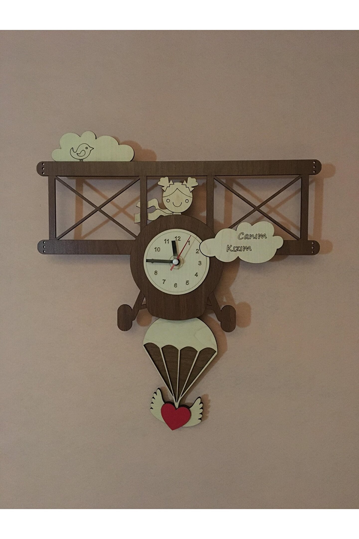 Goodtime Canım Kızım Uçak Dekoratif Sarkaçlı Duvar Saati ; Lütfen taklitlerden kaçınınız. Saatin markası "goodtime" dır. ; Ürün özellikleri: ; - 1. Kalite Ahşap Mdf Malzemeden üretilmiştir. ; - Ürün tamamen el yapımıdır. (hand made) ; - 2 adet AA pil ile çalışır. ; - 1 adet pil, saati çalıştırır; diğer pil sarkacıhareket ettirir. ; - Her saniyede “Uçan Balon” sağa solahareket eder. ; - Kız ve erkek çocukları için 2 farklı modelimevcuttur. ; - Mekanizması yüksek kaliteli sessiz (quartz)çalışan akar saattir. ; - Saat üzerindeki akrep, yelkovan ve saniyemetal malzemedir. ; - Montaj şekli: Duvar çivisi ; - Montaja hazır özel askı aparatı ile bir çiviveya vidayla duvara kolayca sabitleyebilirsiniz. ; -Mutfak, oturma odası,çocuk odası,salon ve özel günlerinizde hediye olarak tercih edebileceğiniz dekoratif duvar saatidir. ; Ürün ebatları: ; Sarkaç Dahil Yükseklik: 41 cm ; Genişlik : 35,5 cm ; Derinlik : 4 cm ; Mdf Kalınlığı: 3 mm ;