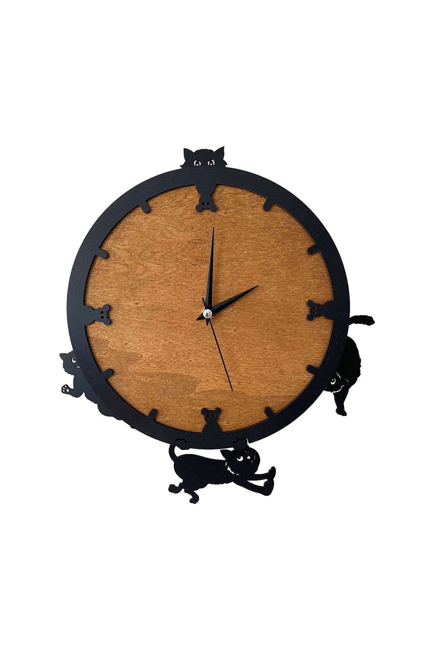 Goodtime dekoratif sallanır sarkaçlı kedi figürlü duvar saati ; Ürün özellikleri: ; - 1. Kalite Ahşap Mdf Malzemeden üretilmiştir. ; - Ürün tamamen el yapımıdır. (hand made) ; - 2 adet AA pil ile çalışır. ; - 1 adet pil, saati çalıştırır; diğer pil sarkacıhareket ettirir. ; - Her saniyede “Saat etrafındaki dört kedi”sağa solahareket eder. ; - Mekanizması yüksek kaliteli sessiz (quartz)çalışan akar saattir. ; - Saat üzerindeki akrep, yelkovan ve saniyemetal malzemedir. ; - Montaj şekli: Duvar çivisi ; - Montaja hazır özel askı aparatı ile bir çiviveya vidayla duvara kolayca sabitleyebilirsiniz. ; -Mutfak, oturma odası,çocuk odası,salon ve özel günlerinizde hediye olarak tercih edebileceğiniz dekoratif duvar saatidir. ; Ürün ebatları: ; Sarkaç DahilYükseklik: 32 cm ; Sarkaç DahilGenişlik : 32 cm ; Saat Gövde Çapı: 26 cm ; Derinlik : 6 cm ; Mdf Kalınlığı: 11 mm ;