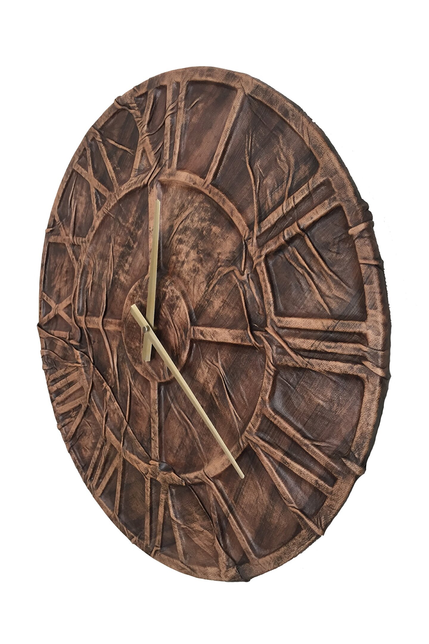 Goodtime El İşçiliği Dekoratif Eskitme Deri Duvar Saati ; Ürün özellikleri: ; - Gerçek sığır derisi ile kaplanmıştır. ; - Gövde kaplaması; deri büzdürme ve eskitme tekniği kullanılarak el işçiliğiile yapılmıştır. ; - Ürün tamamen el yapımı (hand made) ve el boyaması ile üretilmektedir. ; - Kaplama altı 1. Kalite Ahşap Mdf Malzemeden üretilmiştir. ; - 1 adet AA pil ile çalışır. ; - Mekanizması yüksek kaliteli sessiz (quartz) çalışan akar saattir. ; - Saat üzerindeki akrep ve yelkovan metal malzemedir. ; - Montaj şekli: Duvar çivisi- Montaja hazır özel askı aparatı ile bir çivi veya vidayla duvara kolayca sabitleyebilirsiniz. ; -Mutfak, oturma odası,çocuk odası,salon ve özel günlerinizde hediye olarak tercih edebileceğiniz dekoratif duvar saatidir. ; Ürün ebatları: ; Saat Çapı : 50 cm ; Derinlik : 8 cm ; Mdf Kalınlığı: 11 mm ;